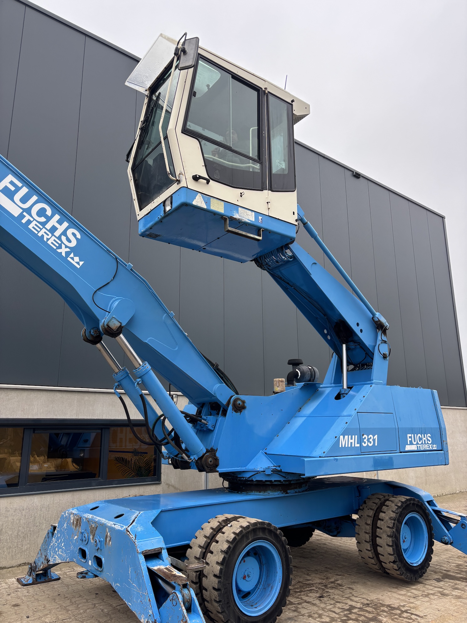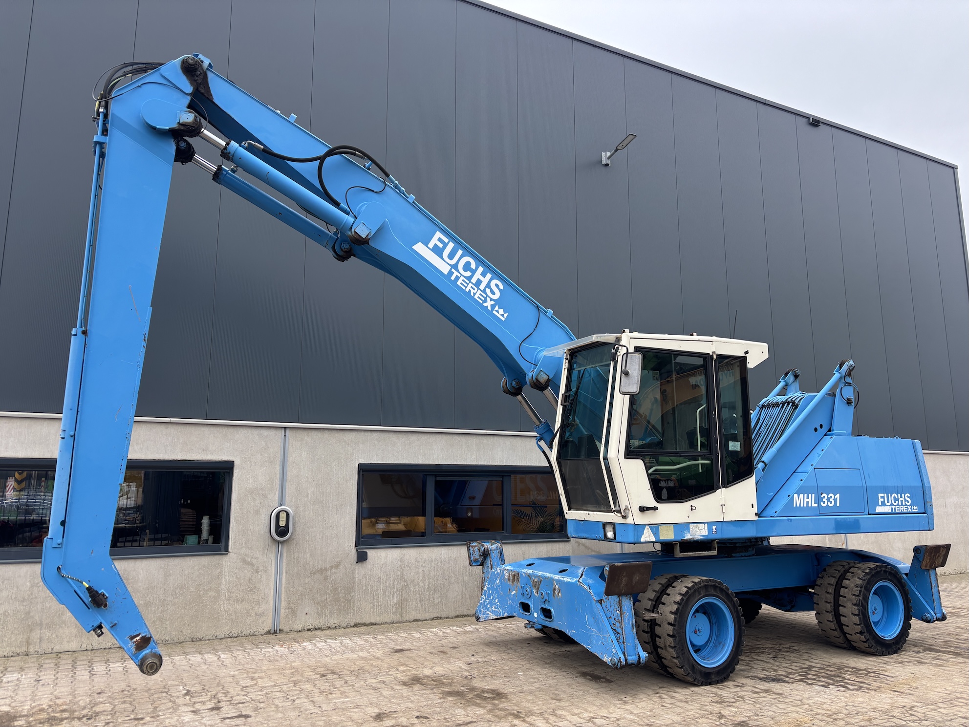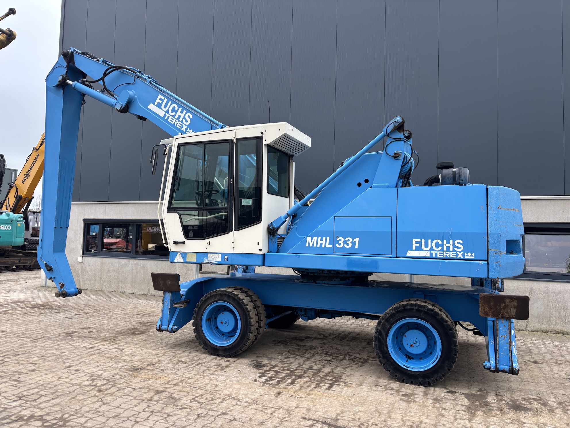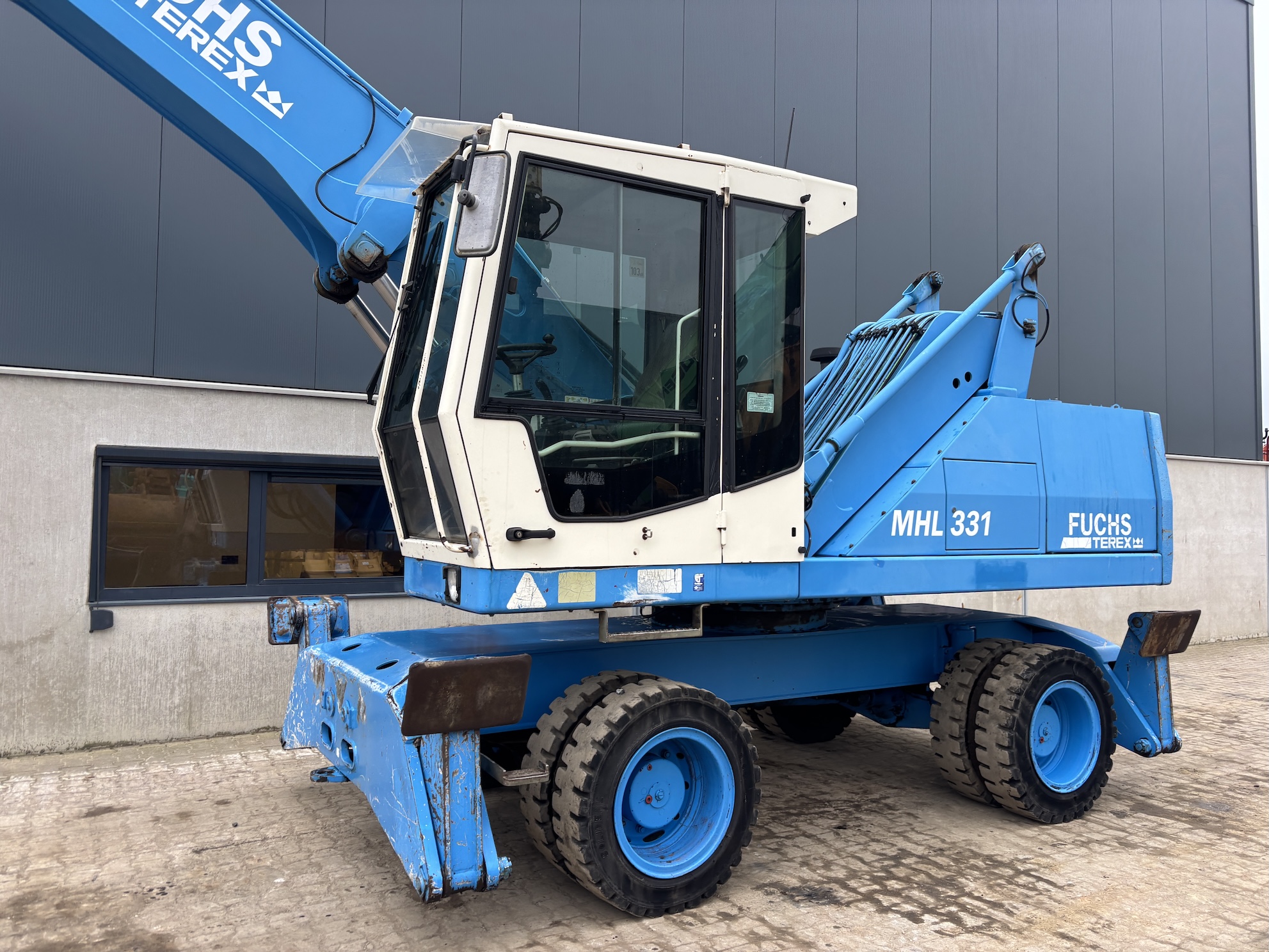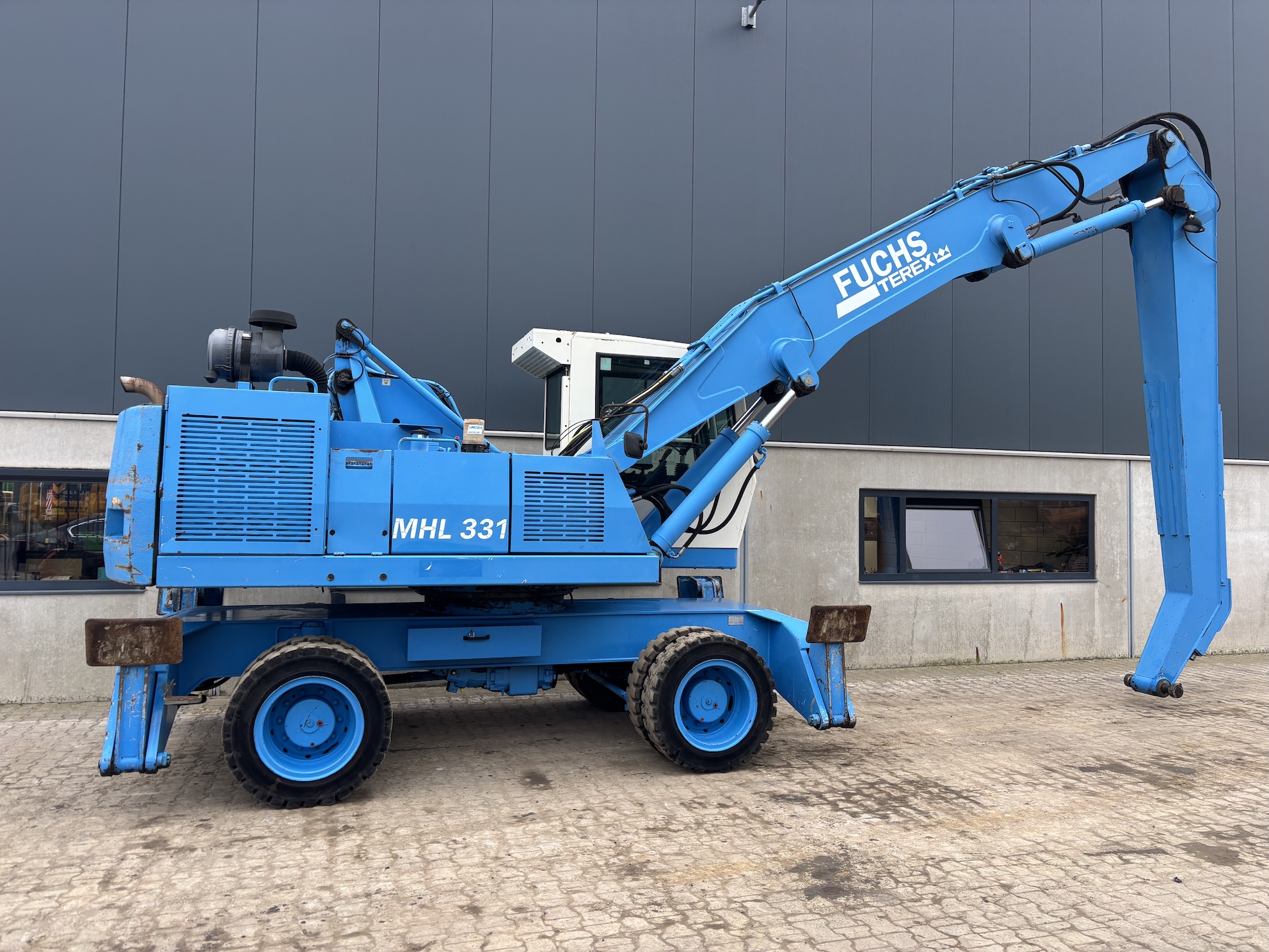 This Fuchs MHL331C is equipped with a 4 cilinder water cooled turbo charged Deutz BF 6M 2012 C (99kW) diesel engine with 14658 working hours on the service meter. 9kW generator for magnet gear, central lubrication, 4x full rubber tires, hydraulic high rise cabin etc.