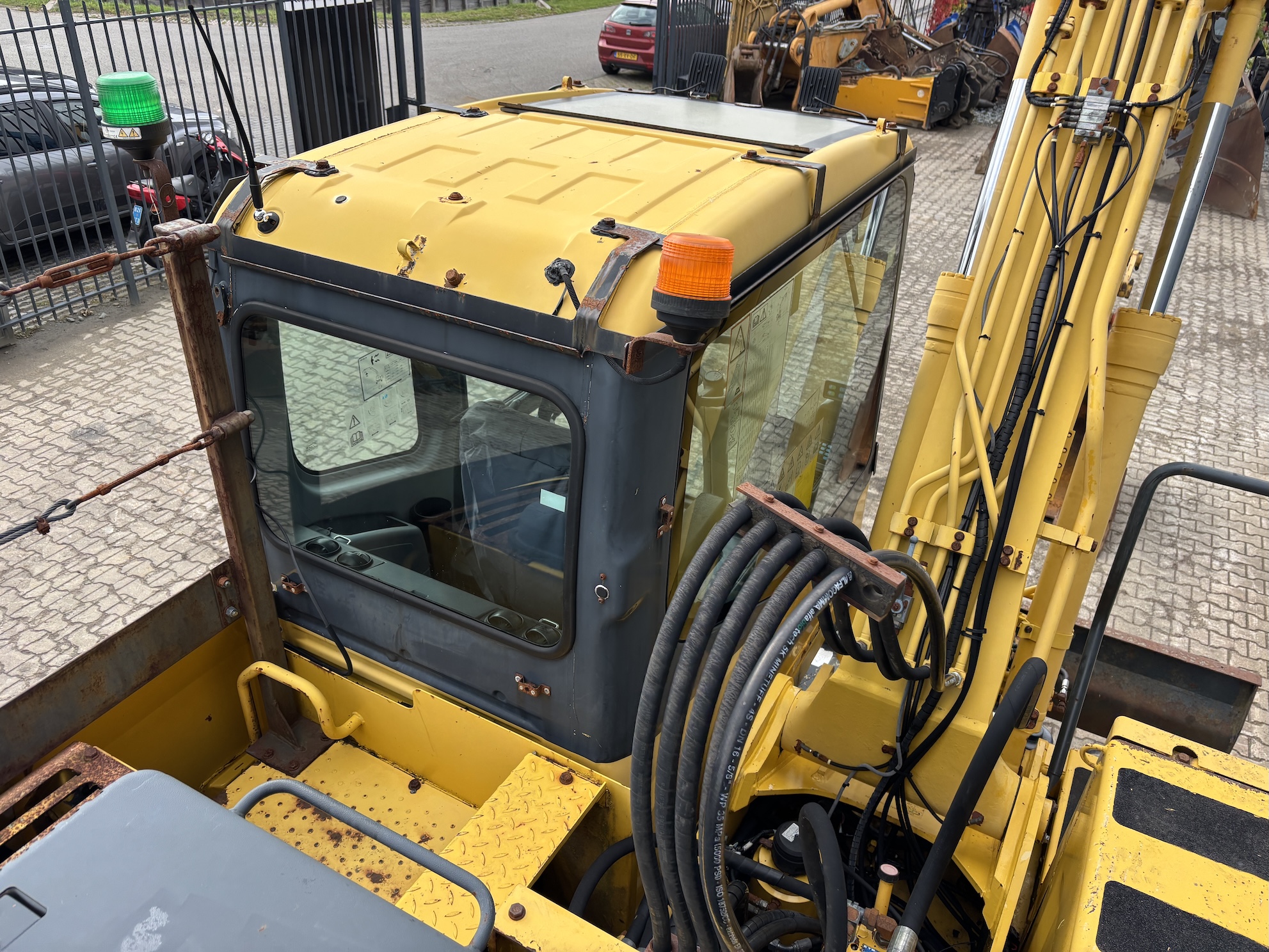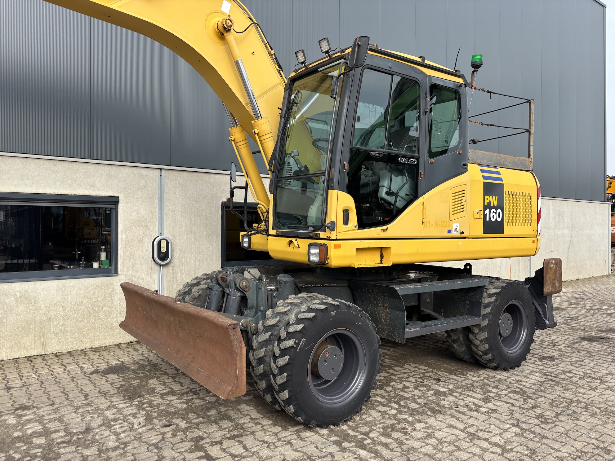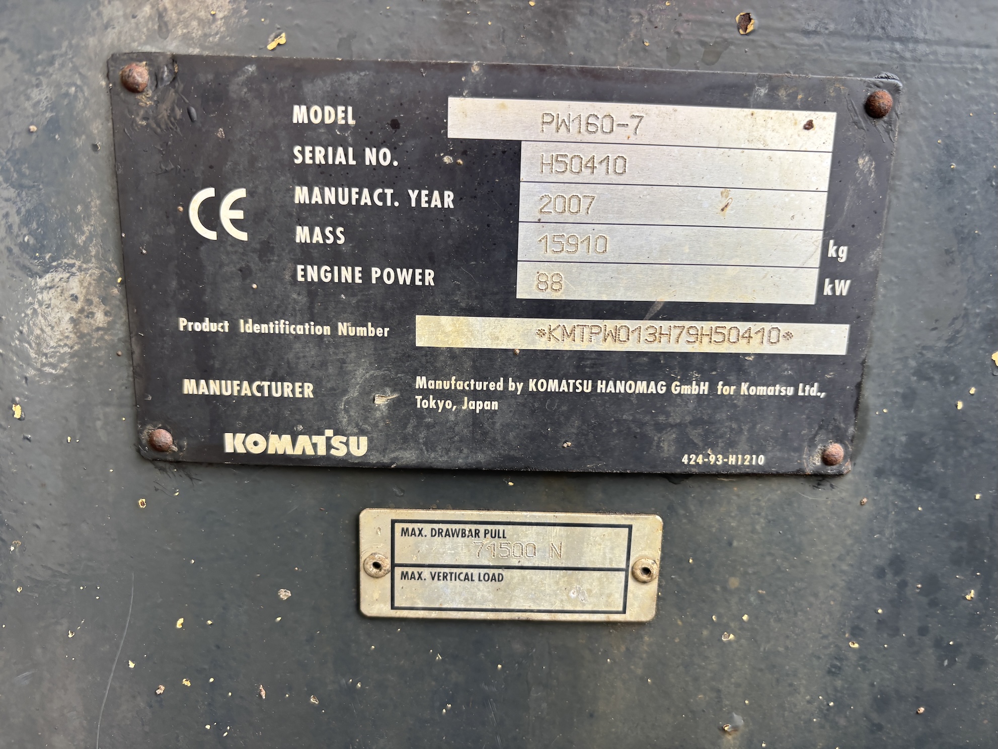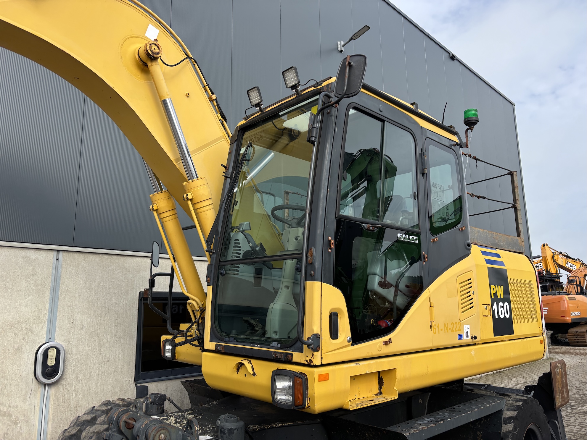 This Komatsu PW160-7 is equipped with a 4 cilinder water cooled turbo charged Komatsu SAA4D107E (88kW) diesel engine with 7552 working hours on the service meter. outriggers, dozer blade, hydraulic quick hitch, teeth bucket, mono boom, additional work lights, safe guard rails, camera (not working), airco, radio etc.