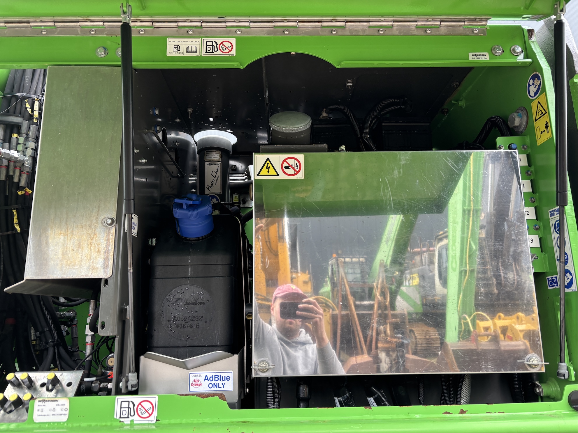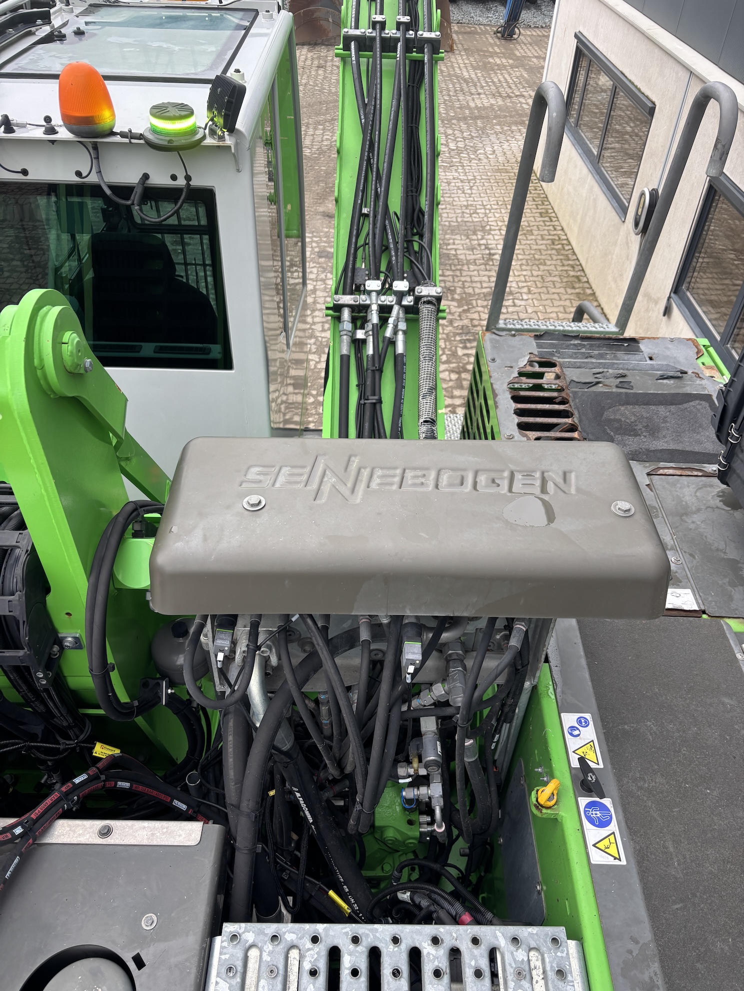 This Sennebogen 818M is equipped with a 4 cilinder water cooled turbo charged Cummins QSB4.5 (97kW) diesel engine with 8506 working hours on the service meter. K10 equipment (6,2m boom and 3,8m ULM stick), MP21E undercarriage, 4 outriggers, fire suppression system, central lubrication, cabin protection, trailer hook, full rubber tires, side and rear view camera, airco, radio, high rise cab etc..