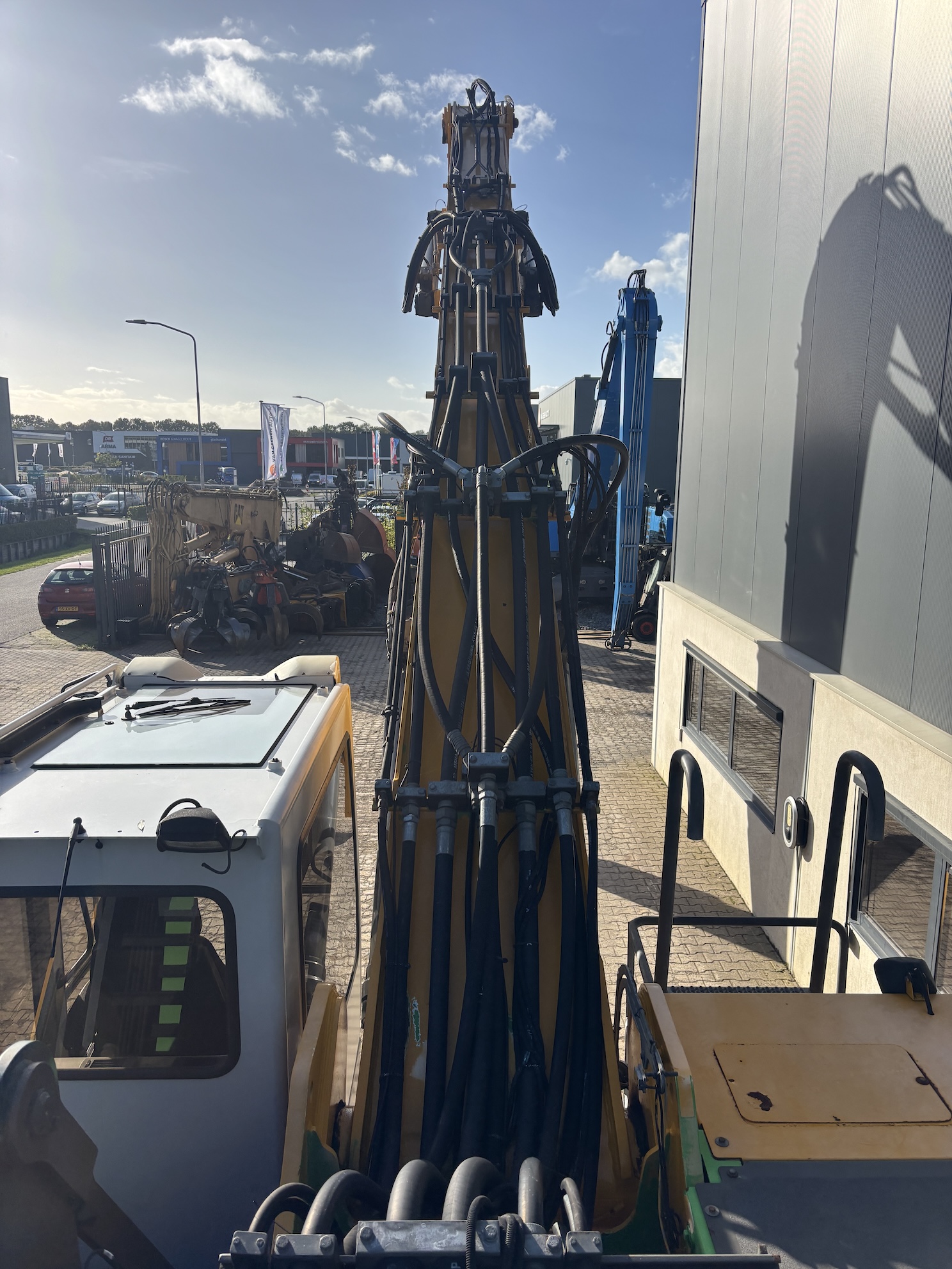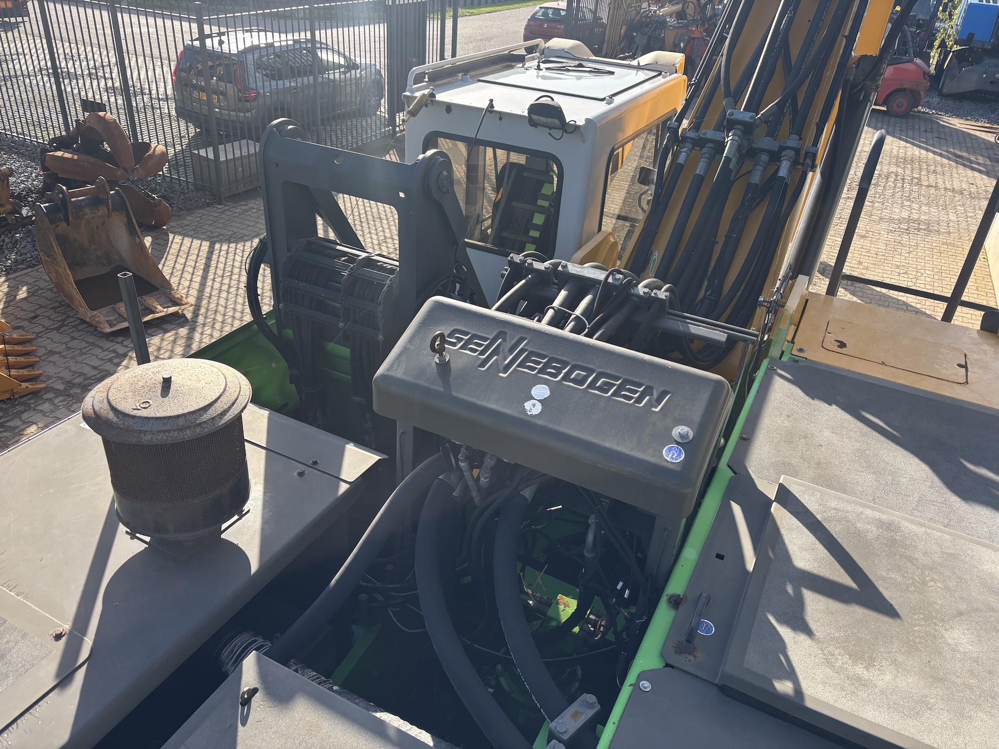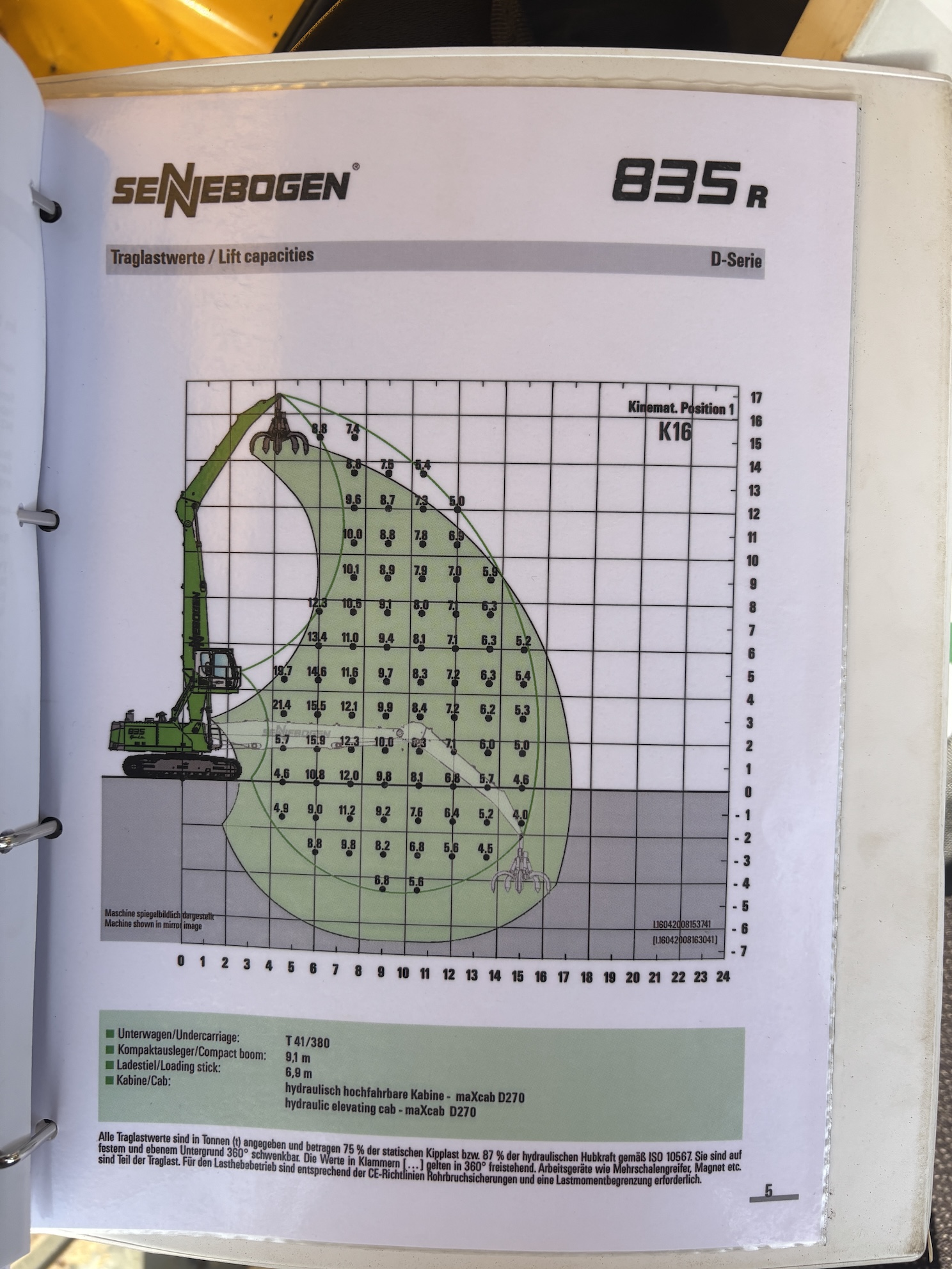This Sennebogen 835R D-serie is equipped with a 6 cilinder water cooled turbo charged Cummins QSB6.7 (194kW) diesel engine with 17497 working hours on the service meter. 9.1 meter boom, 6.9 meter stick which results in K16 equipment, mechanically extendable undercarriage, body platform in front of cabin (not in pictures), extra work lights, maintenance history and additional books, camera on stick, airco, radio, central lubrication etc..