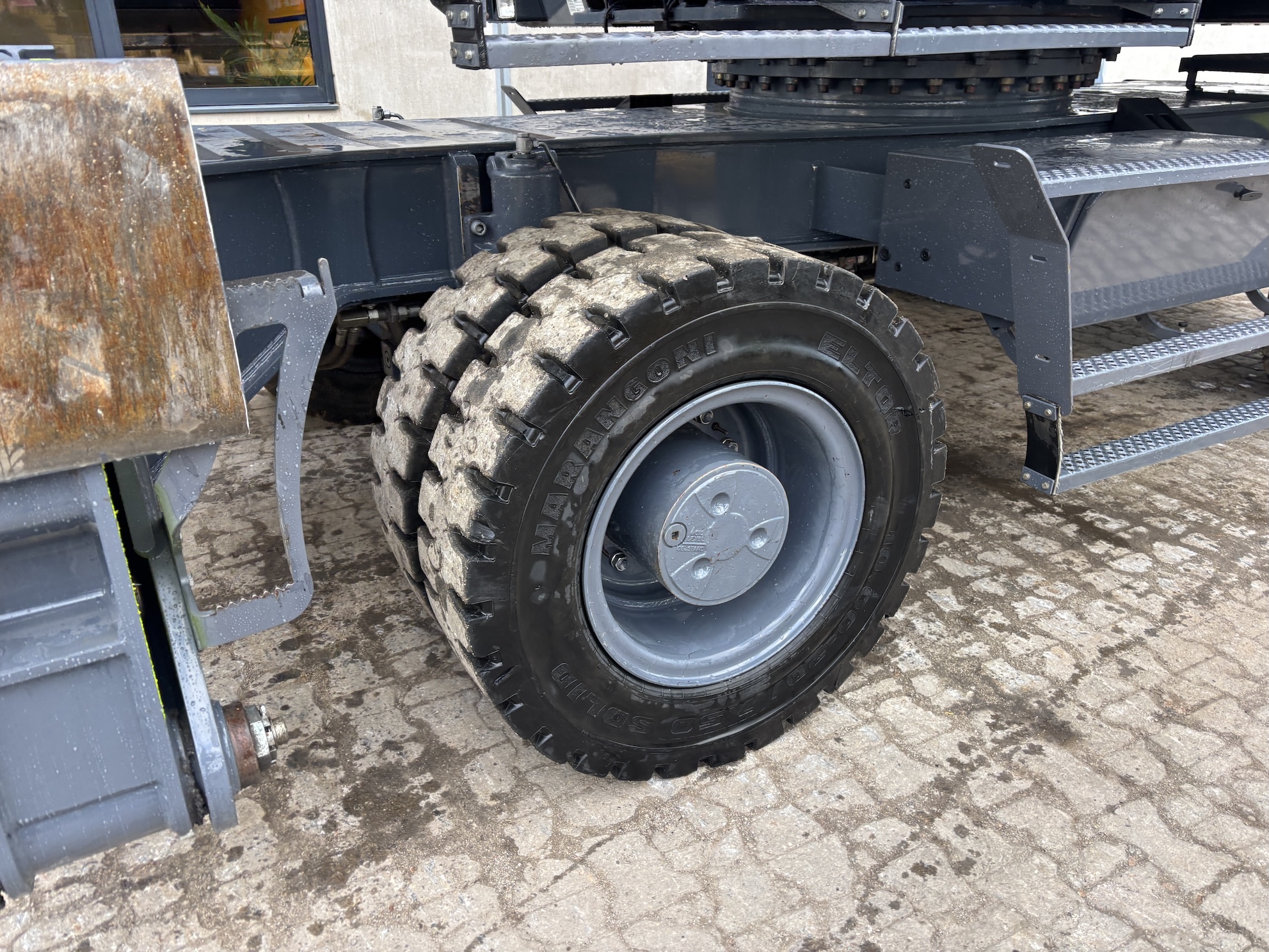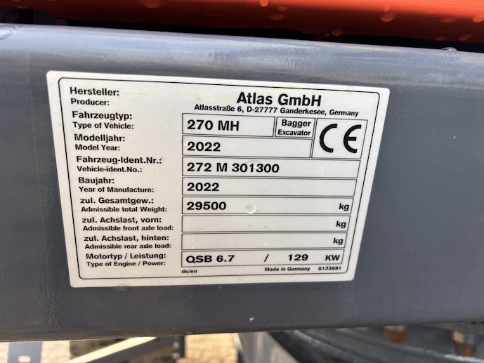 This Atlas 270MH has just 1912 working hours and is equipped with a Cummins B6.7 water cooled turbo charged diesel engine (129kW). Boom length 8 meters and stick length being 6 meters, resulting in a reach of 14 meters without grab. Cabin protection, additional work lights, safety guards on top, full rubber tires, rear and side view camera, airco, radio, central lubrication etc..