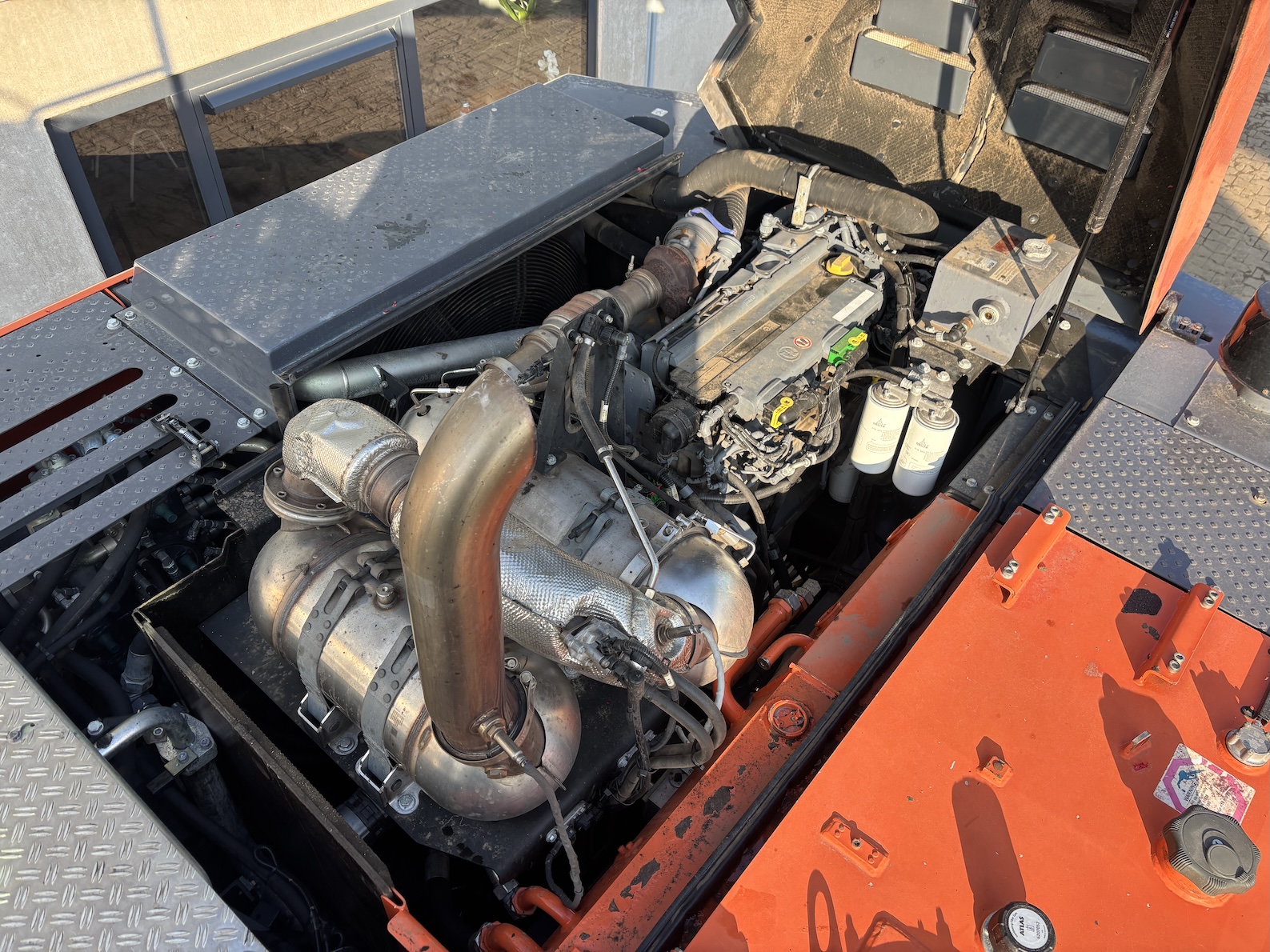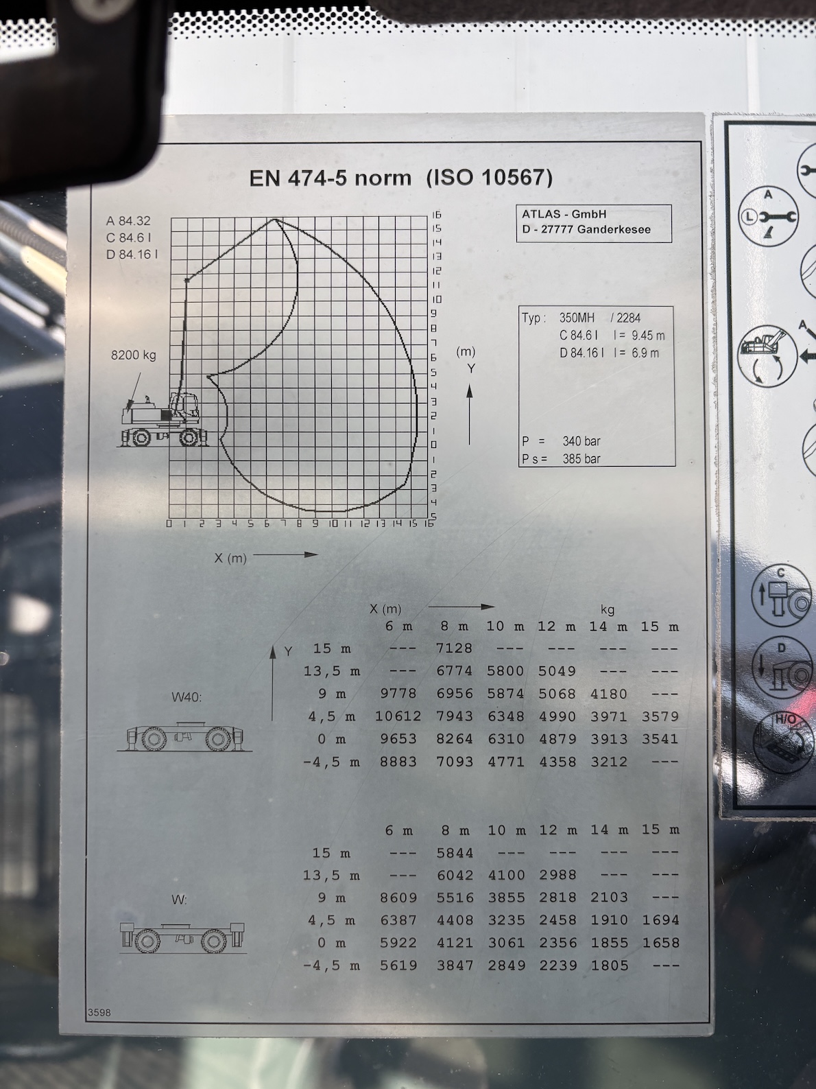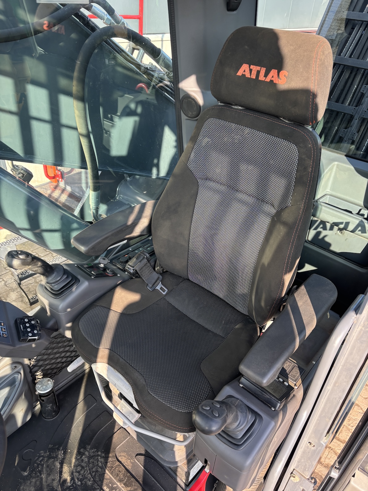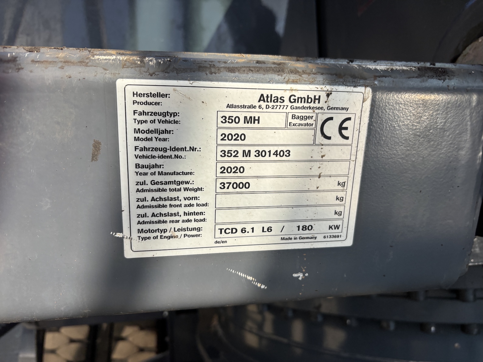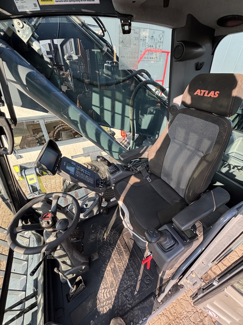 This Atlas 350MH is equipped with a 6 cilinder water cooled turbo charged Deutz TCD6.1 L6 (180kW) diesel engine with 8865 working hours (of which just 5413 hydraulic working hours). Boom is 9.45 meters with stick 6.9 meters, resulting in 16 meter reach. Central lubrication, cabin protection, additional work lights, excellent full rubber tires, rear view camera (currently faded), airco, radio etc.