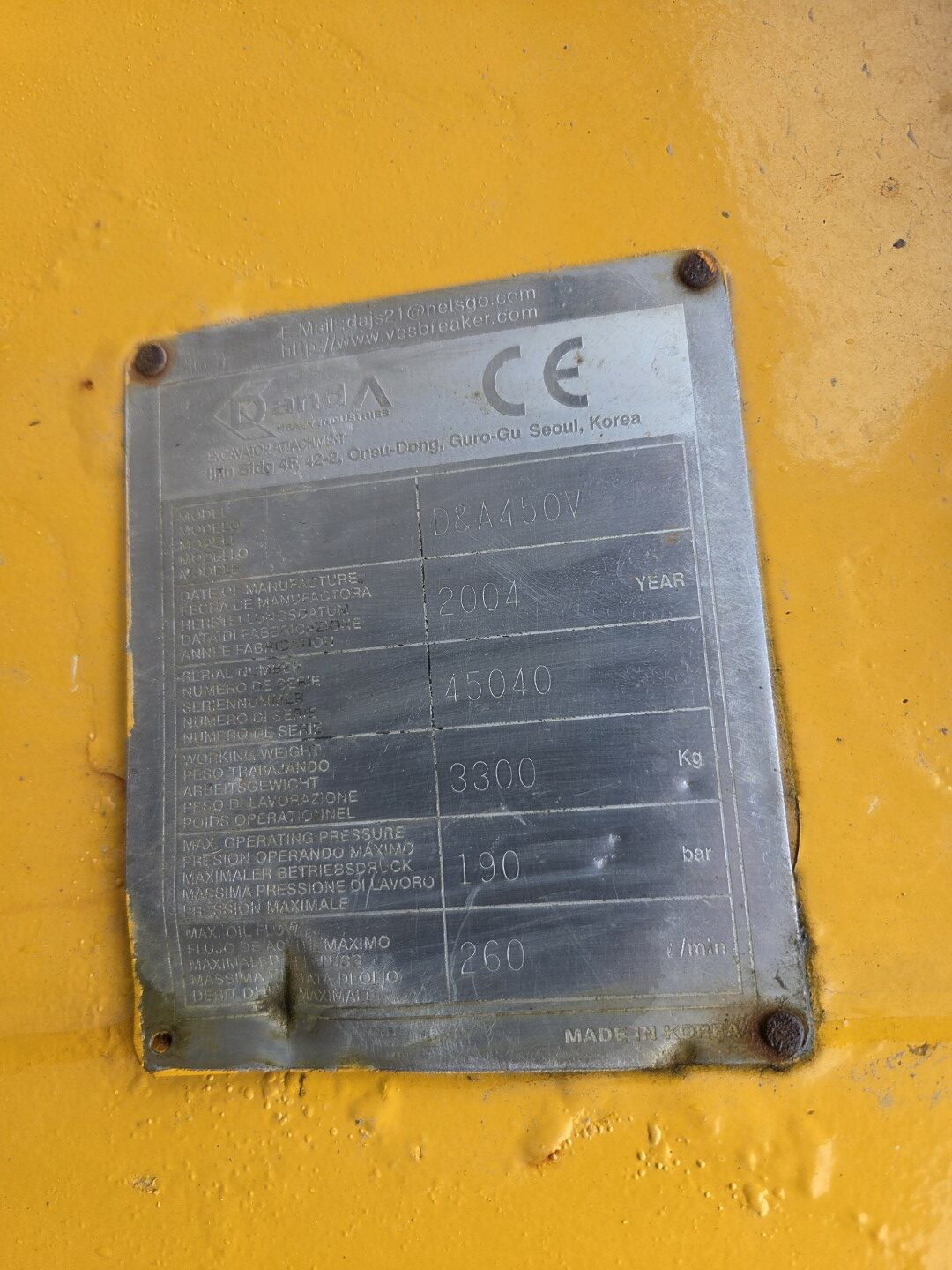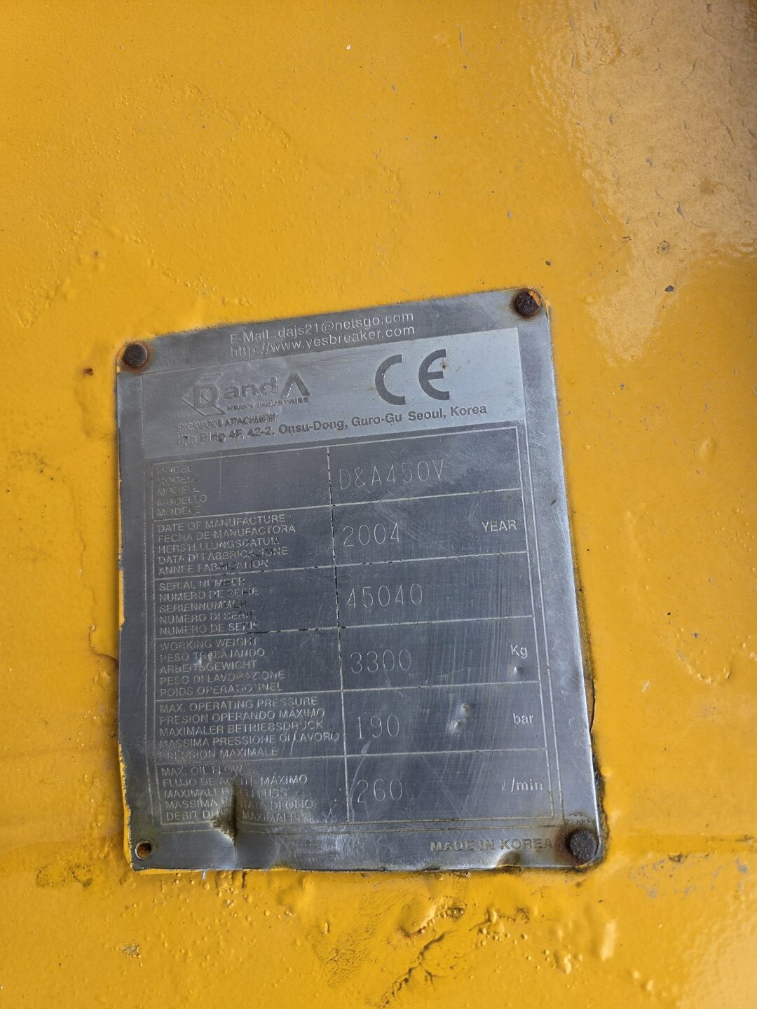 Used Danda D&A 450V hydraulic hammer Real Korean Hammer weight: 3300kg year 2004 connection: Pin 110mm to fit 40 – 50 ton excavators.