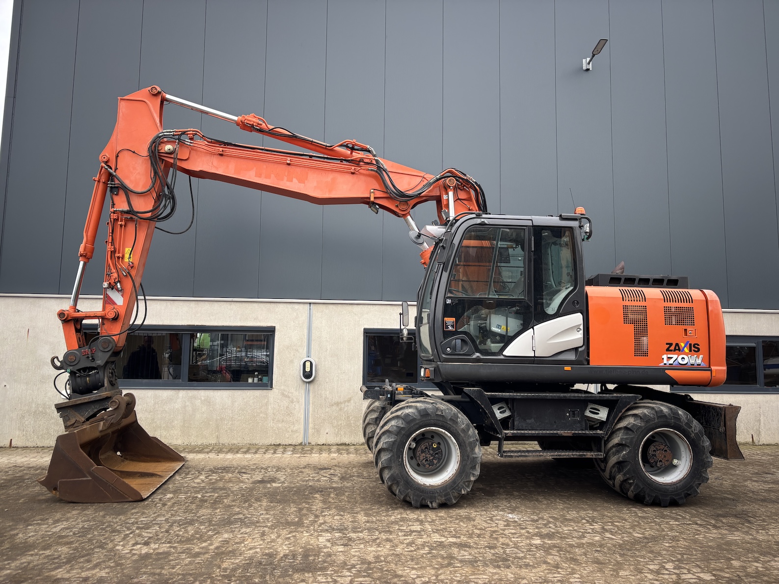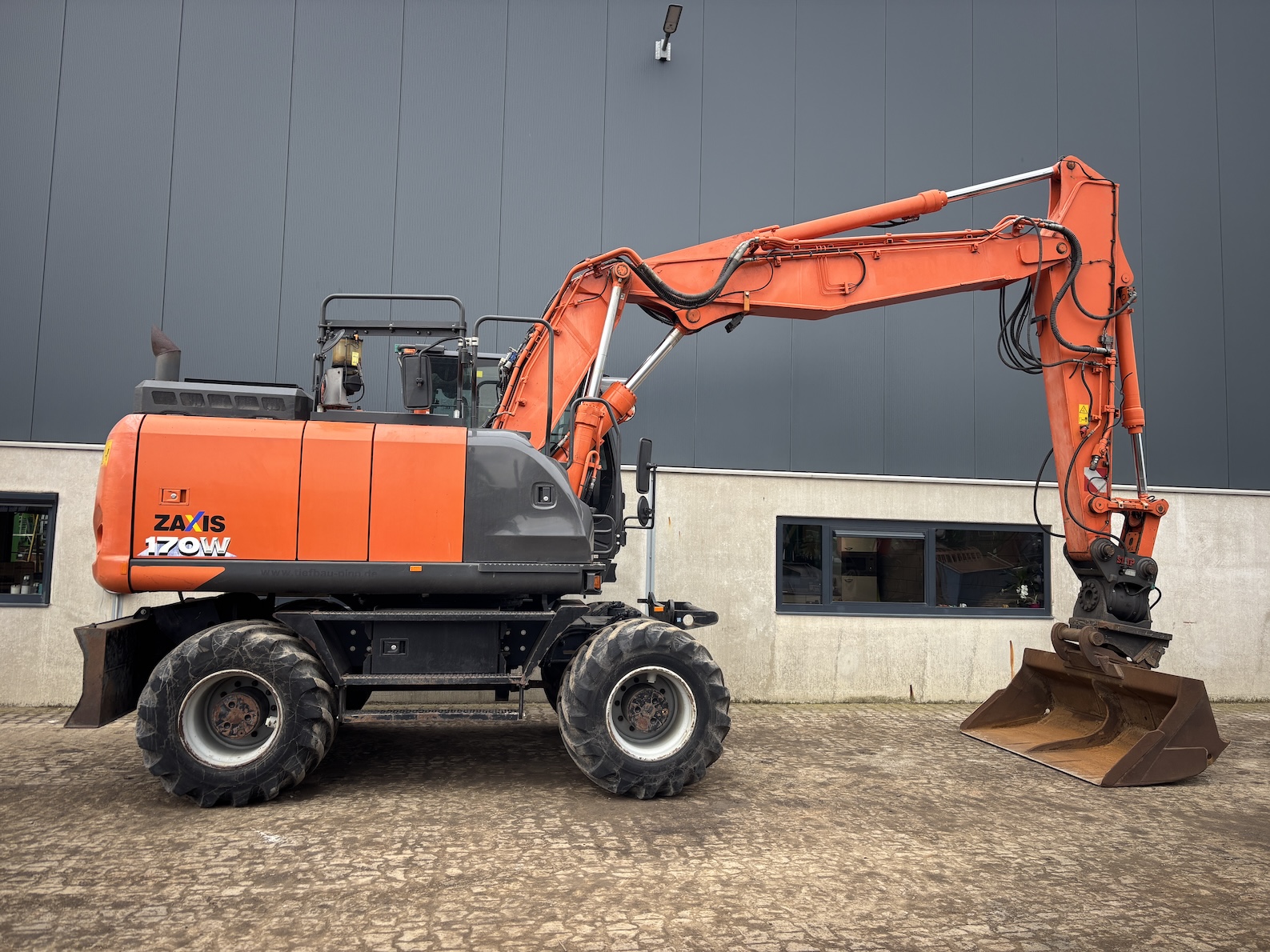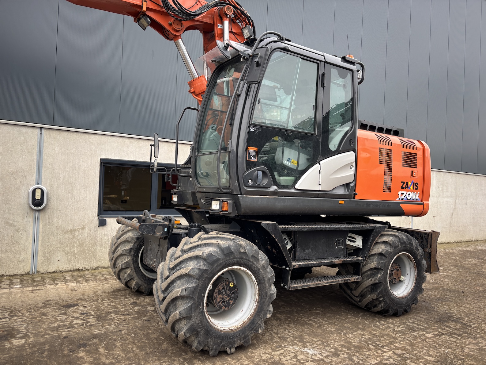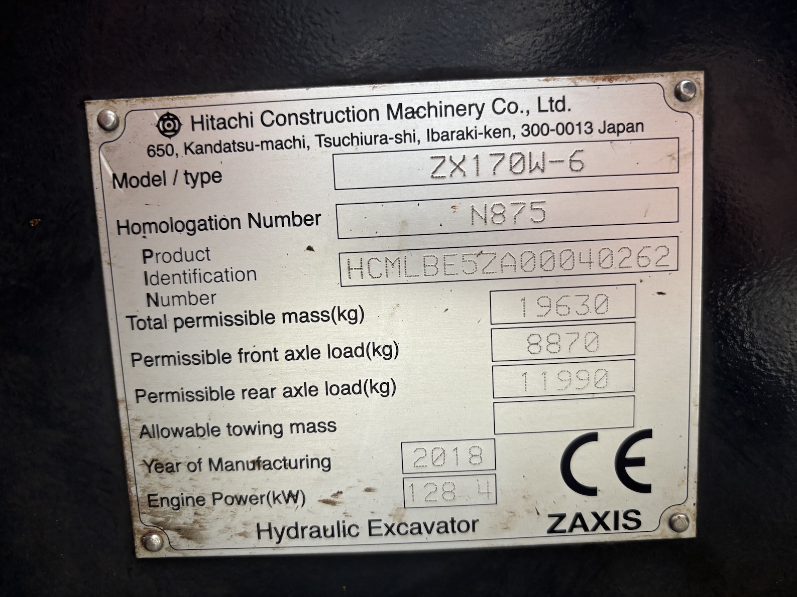 This Hitachi ZX170W-6 is equipped with a 4 cilinder water cooled turbo charged Isuzu 4HKX1 (128kW) diesel engine with just 7723 working hours on the service meter. VA boom, all hydraulic functions possible, hydraulic tilting quick hitch, grading bucket, additional work lights, wide single tires with good profile left, dozer blade, central lubrication, books, rear view camera, airco, radio etc.