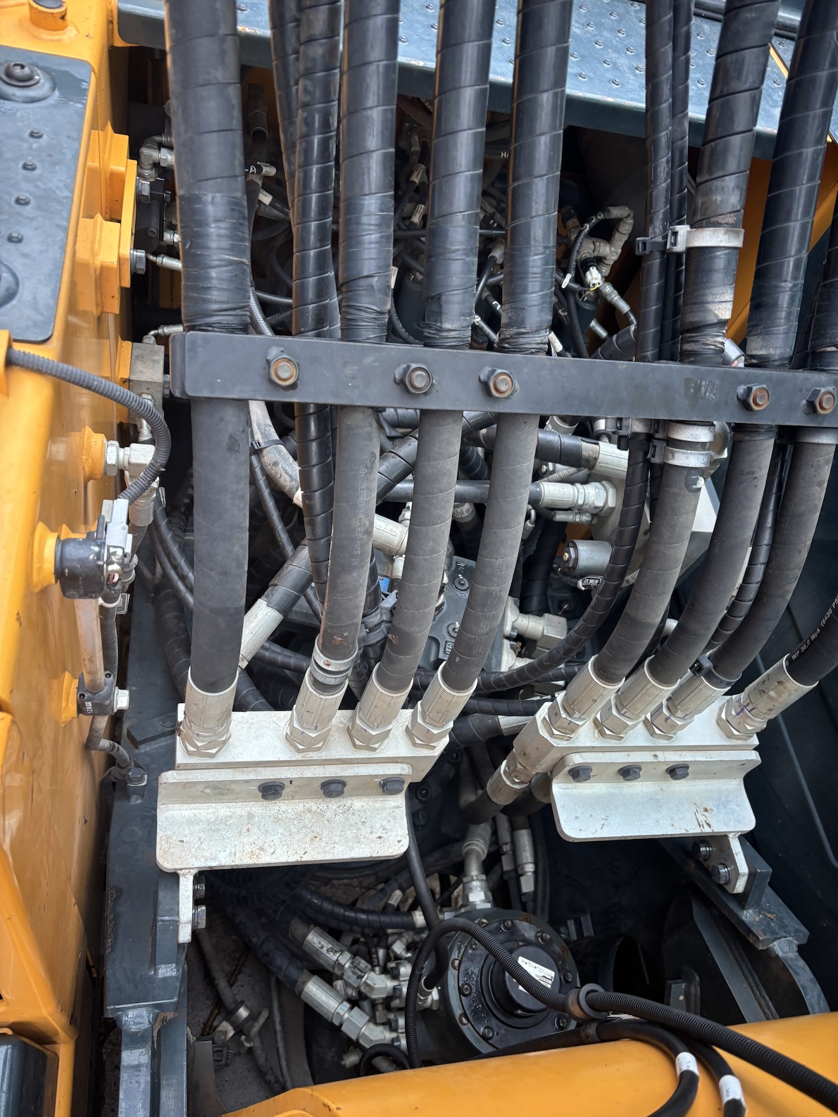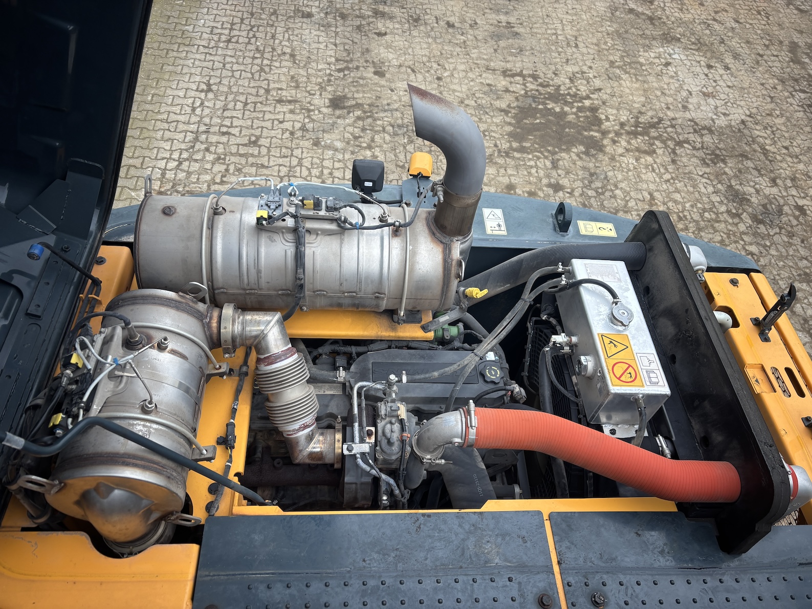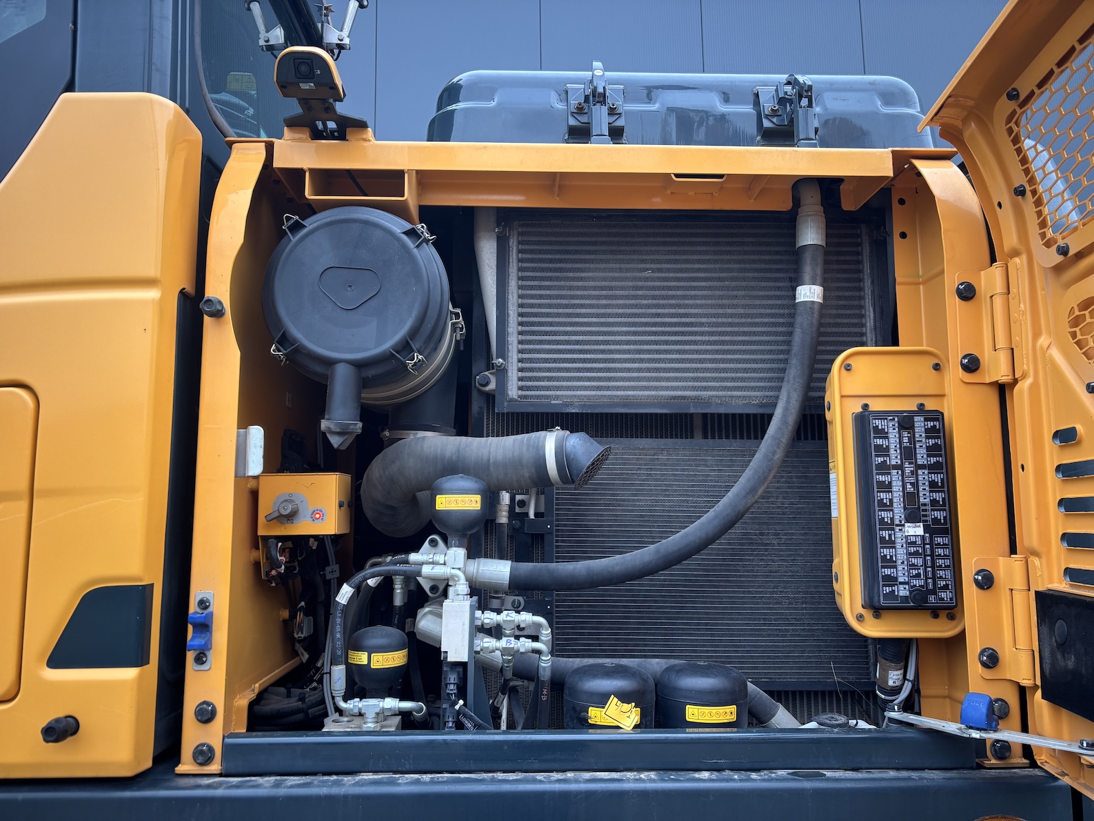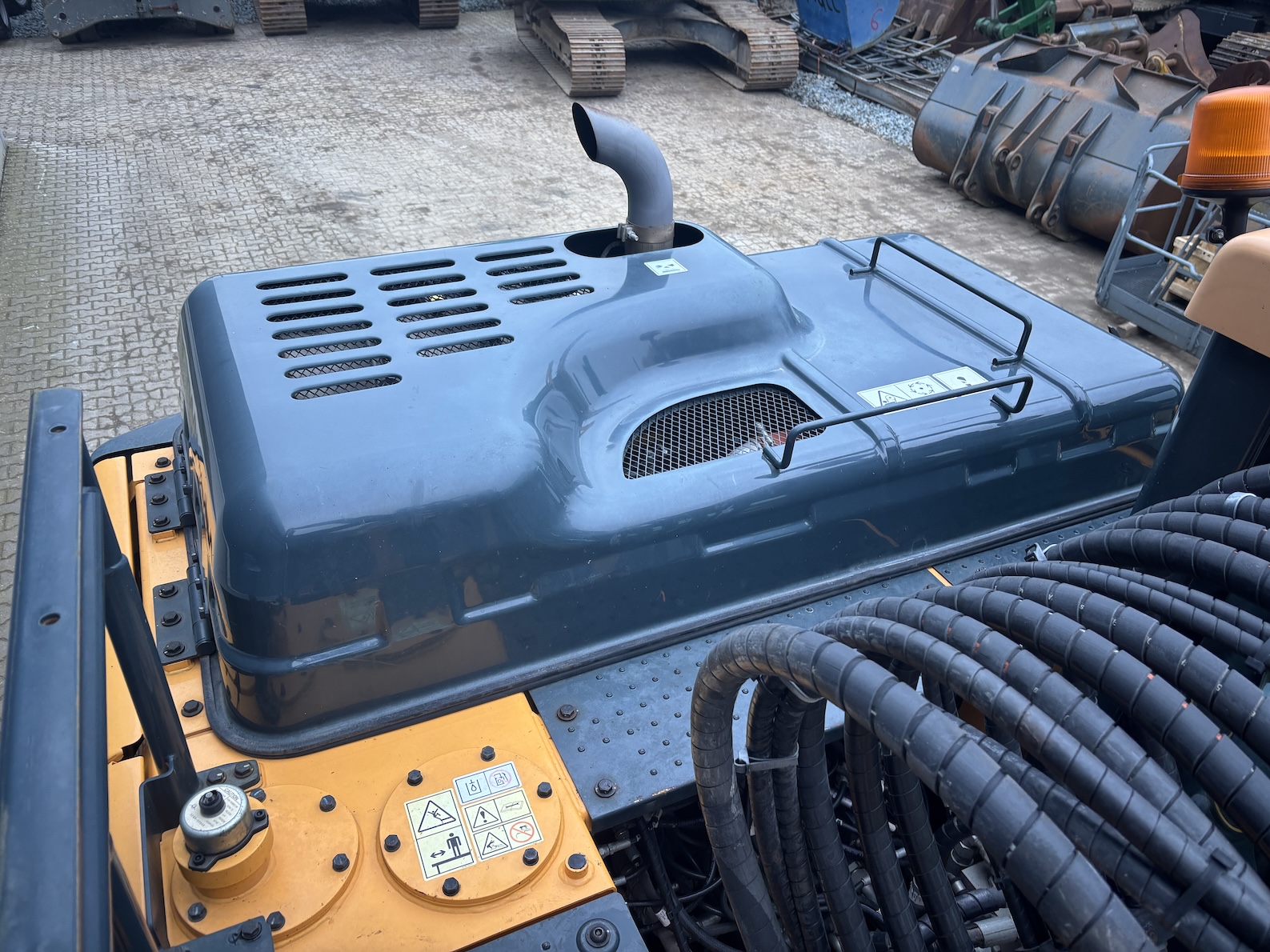 This Hyundai HW180 is equipped with a 6 cilinder water cooled turbo charged Cummins QSB6.7 (127kW) diesel engine with just 1344 working hours on the service meter. VA boom, hydraulics for quick hitch, hammer and rotation piping, mechanical quick hitch, ditch bucket, dozer blade,  like new tires, additional work lights, 360 degrees camera system, all books and papers (NEW) included, electric diesel pump, radio, airco etc.