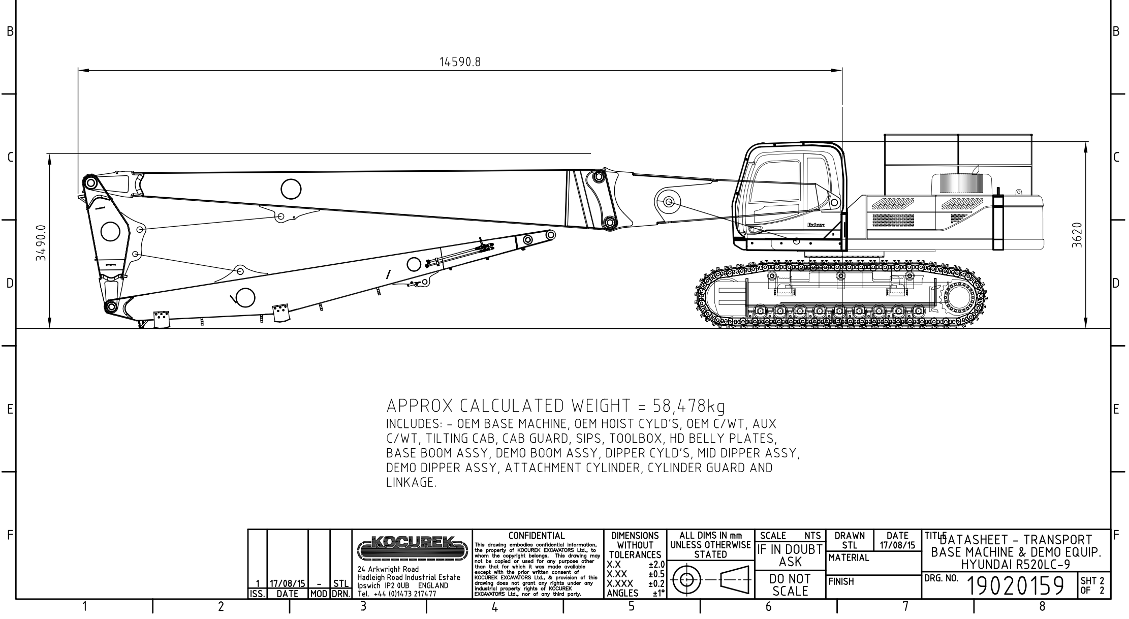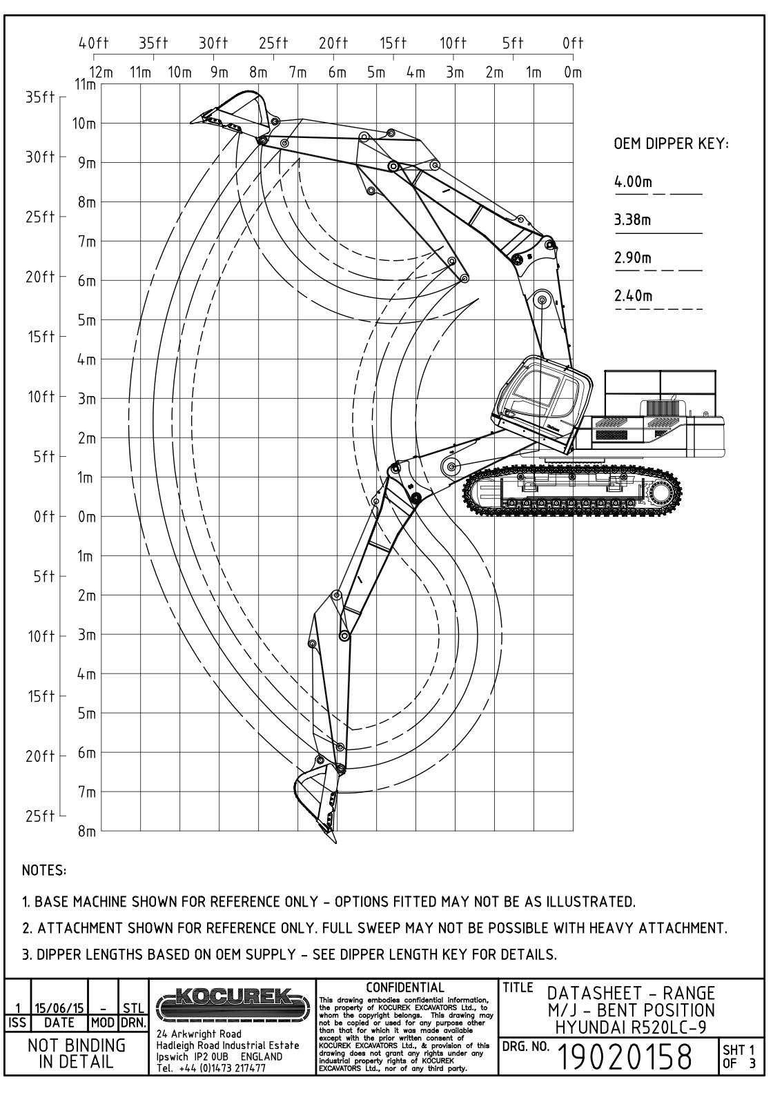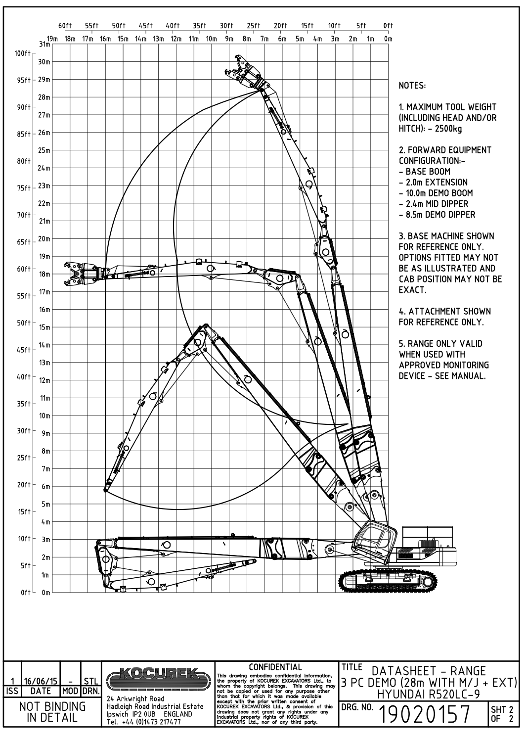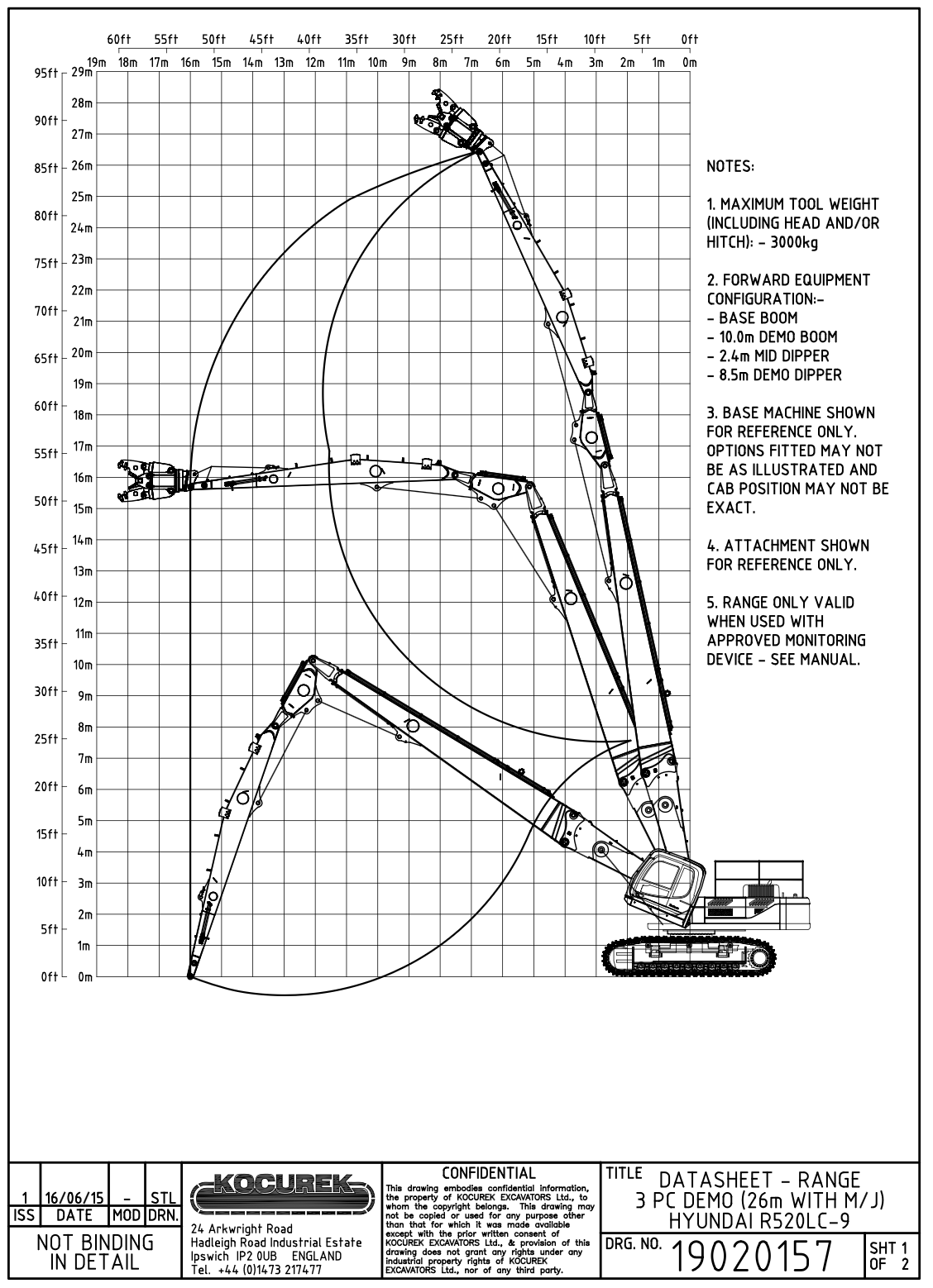 This Hyundai R520LC-9A is equipped with a 6 cilinder Cummins engine with just 5175 working hours on the service meter. Kocurek high reach boom (8.5m demo dipper, 2.4 mid dipper, 10m demo boom, 2m extension) result in 31 meter working height including tool. Additional counter weight, hydraulic tilting cabin, mechanically adjustable undercarriage, short boom, all hydraulic functions, cabin protection etc..