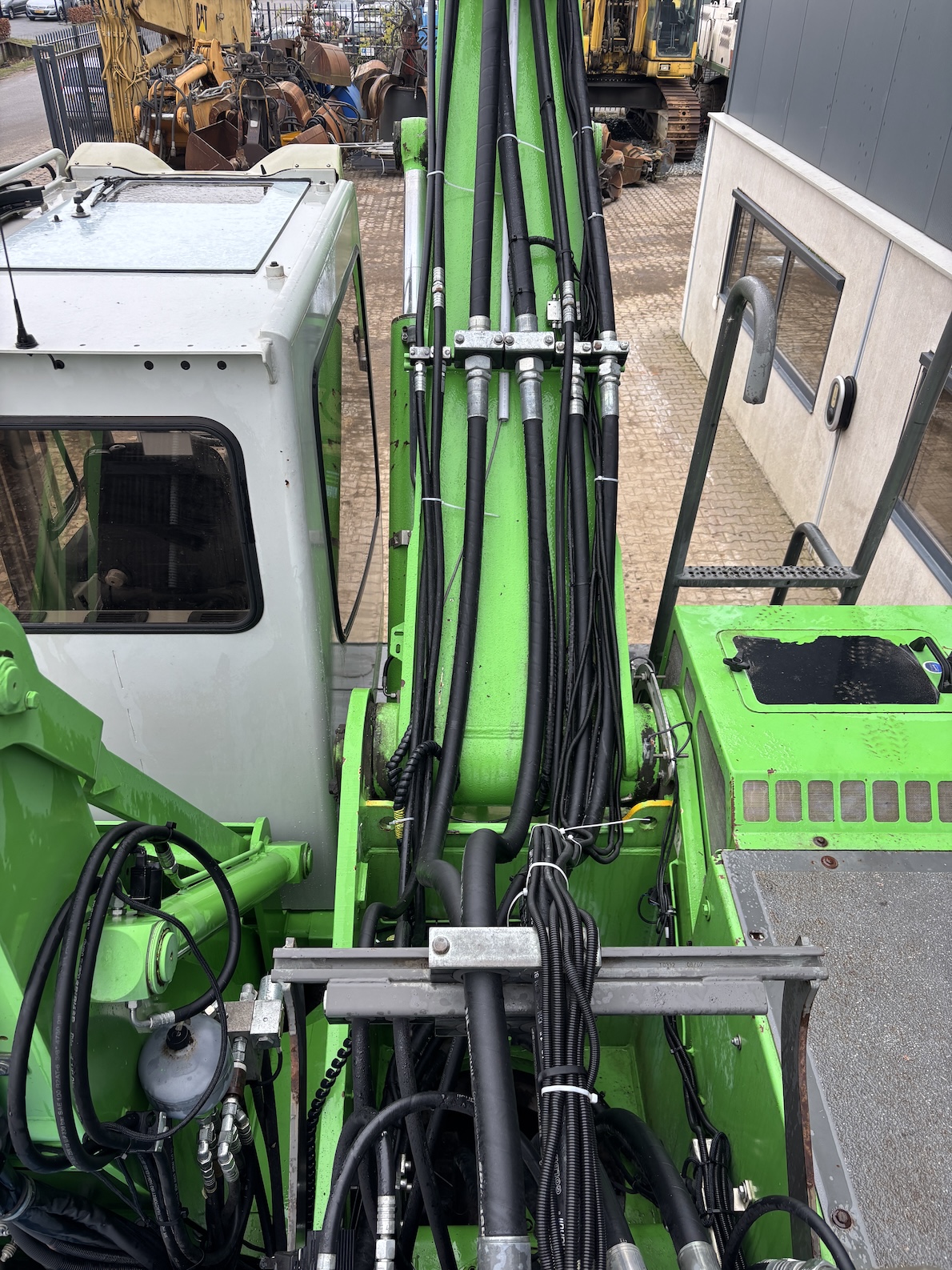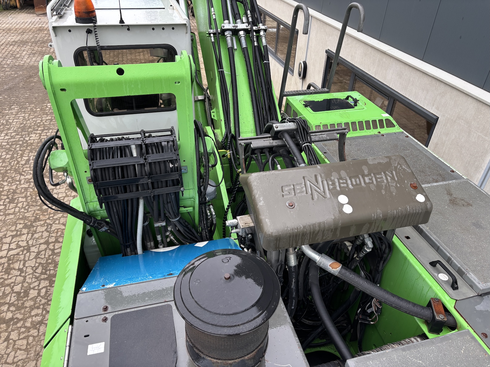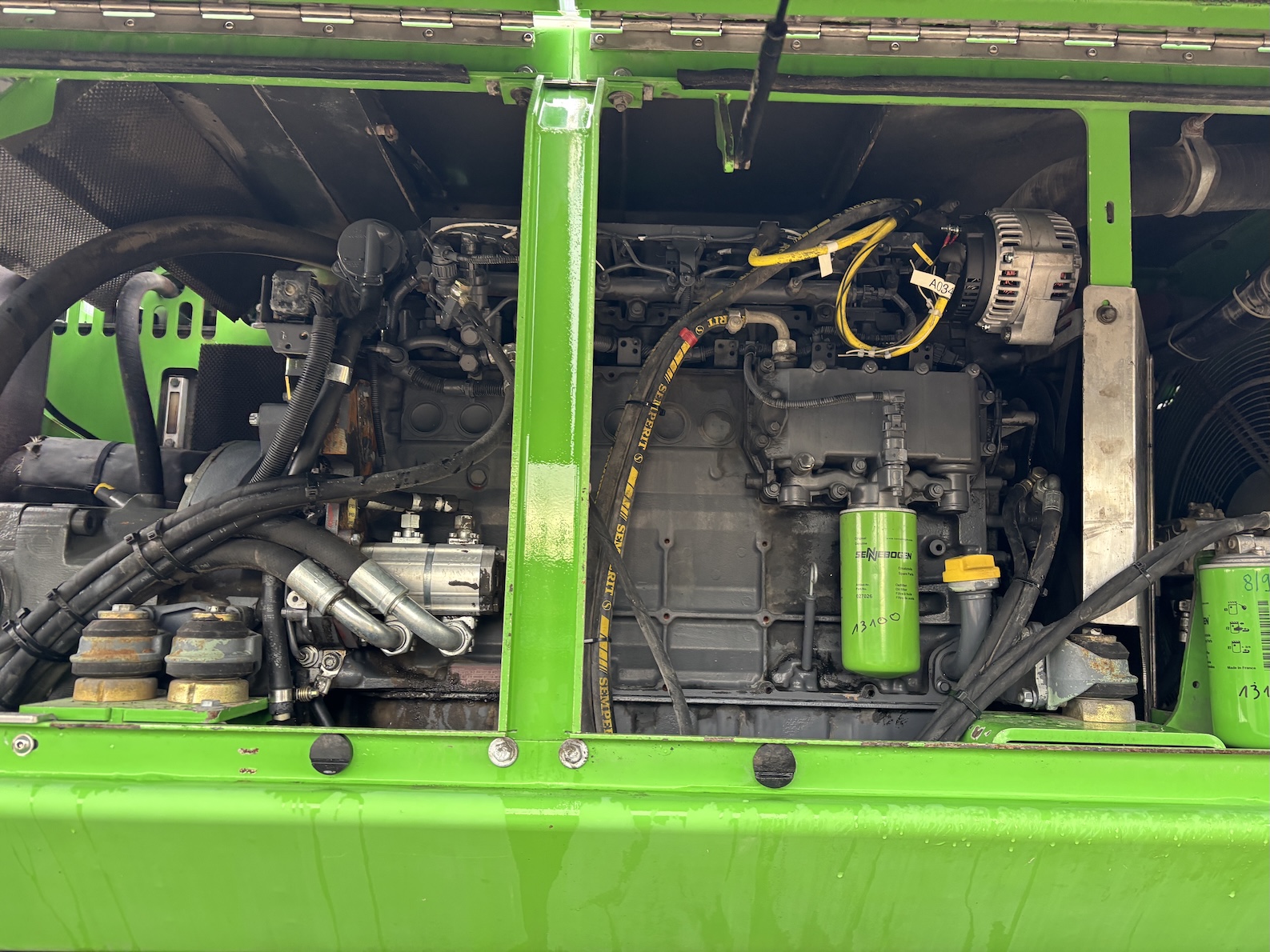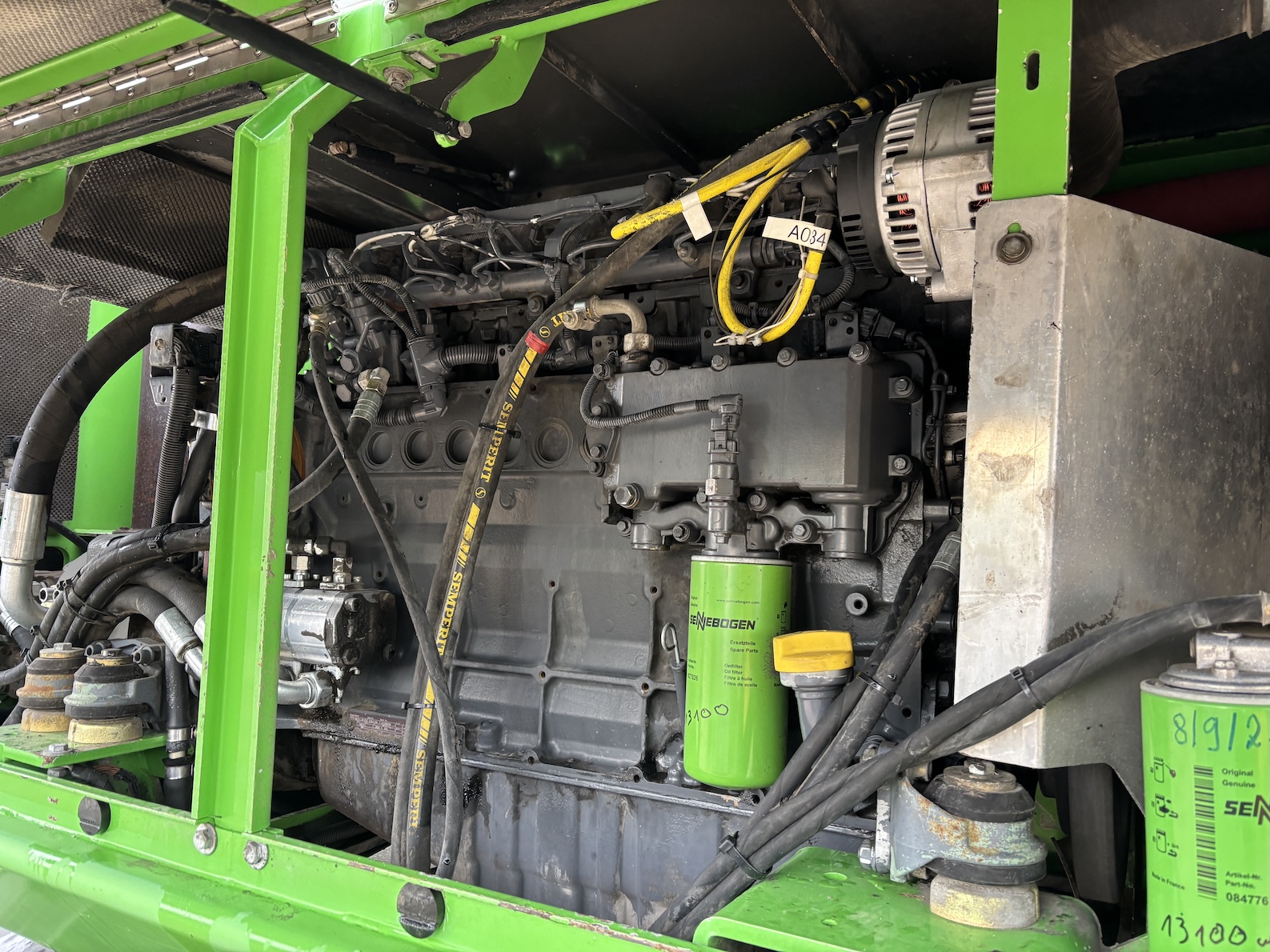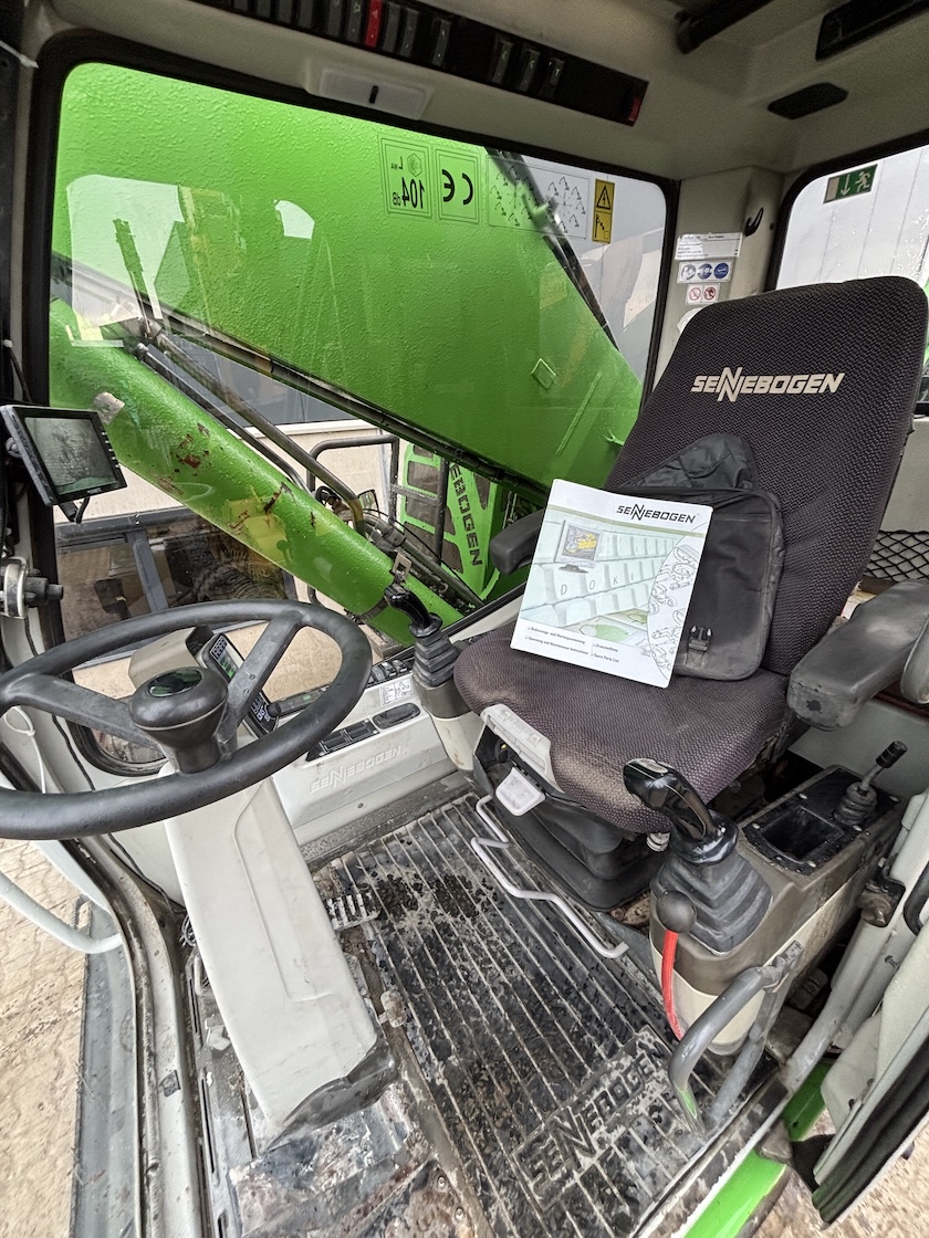 This Sennebogen is equipped with a 6 cilinder water cooled turbo charged (Exchange) Deutz TCD 2013 L 06 2V diesel engine (148kW) with 13449 working hours on the service meter. K17 work equipment (17 meters reach), camera on inside of the stick to look into vessels, 4x full rubber tires, books and manuals available, airco, central lubrication etc.