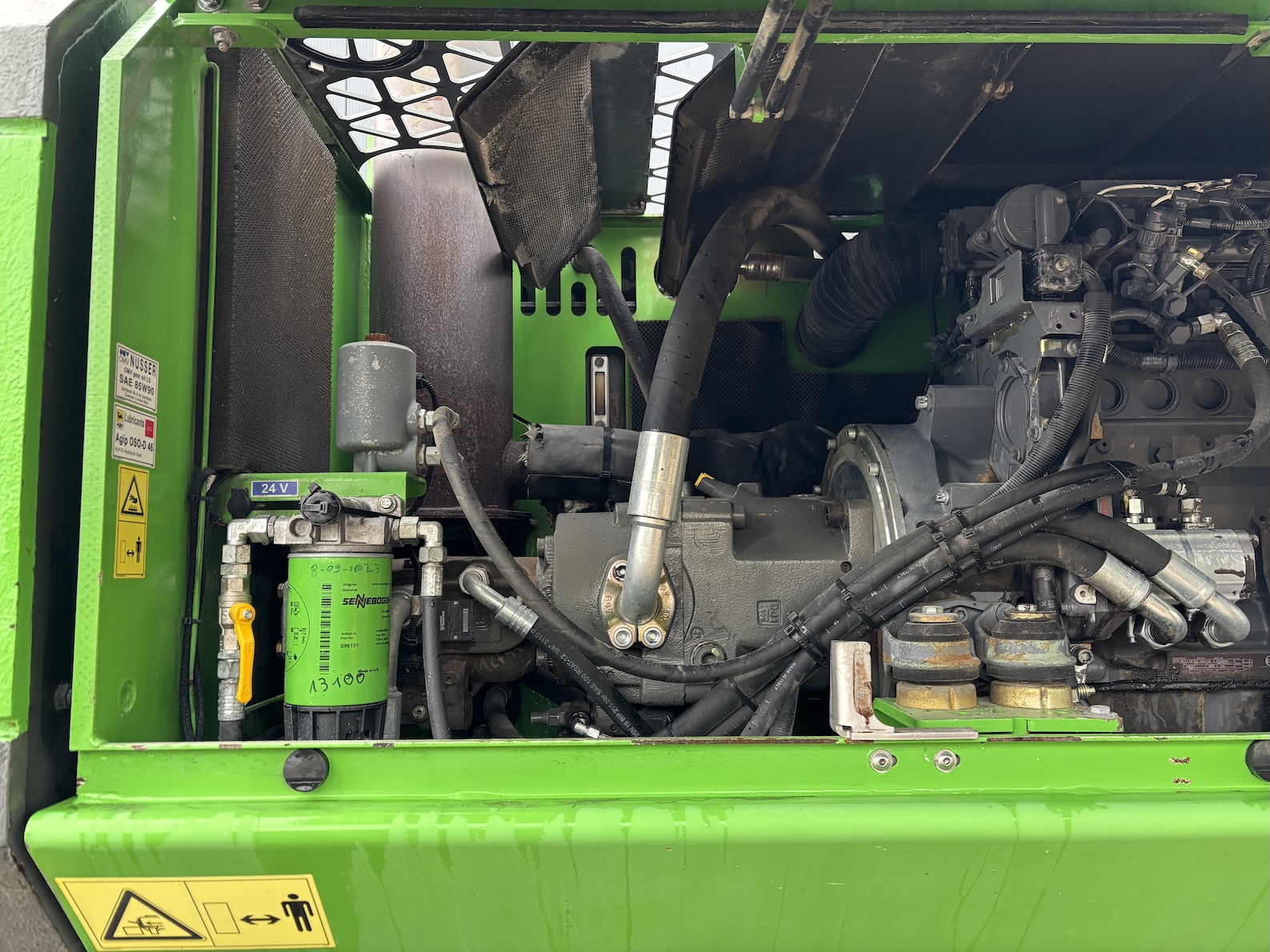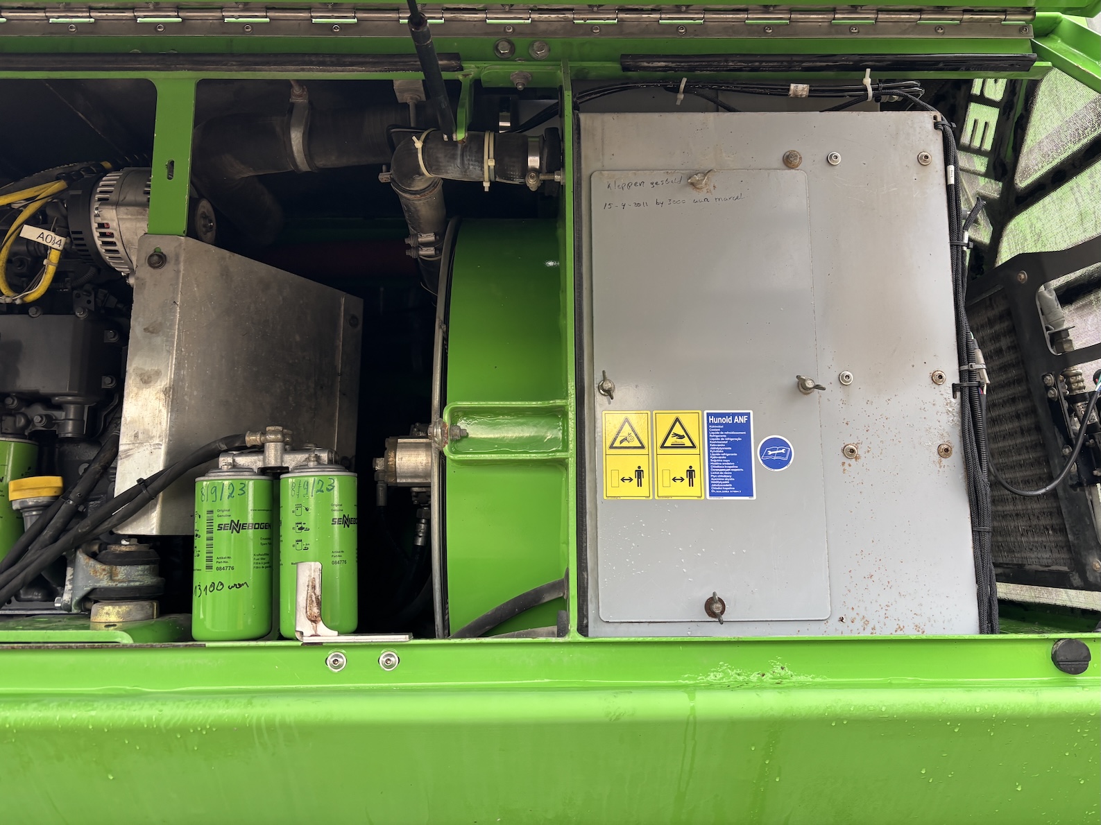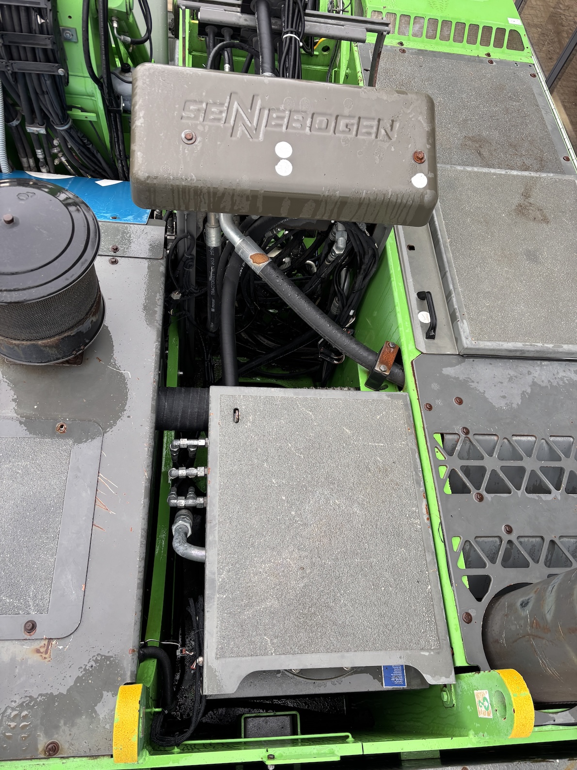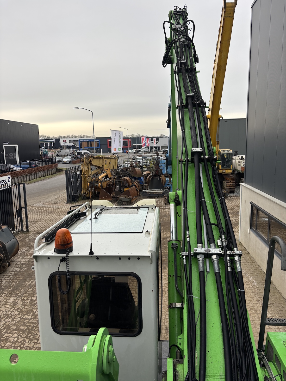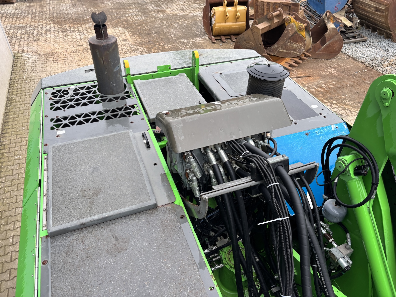 This Sennebogen is equipped with a 6 cilinder water cooled turbo charged (Exchange) Deutz TCD 2013 L 06 2V diesel engine (148kW) with 13449 working hours on the service meter. K17 work equipment (17 meters reach), camera on inside of the stick to look into vessels, 4x full rubber tires, books and manuals available, airco, central lubrication etc.
