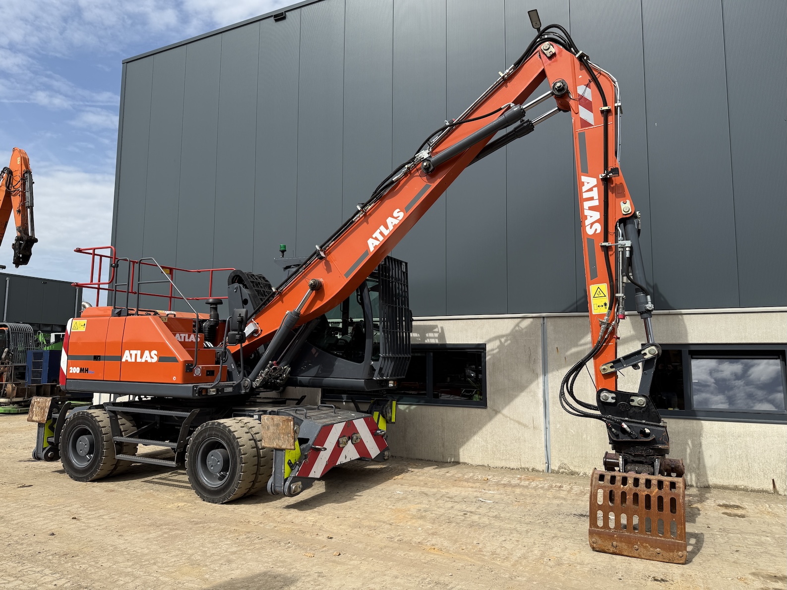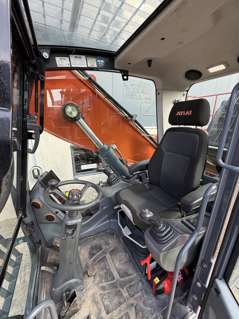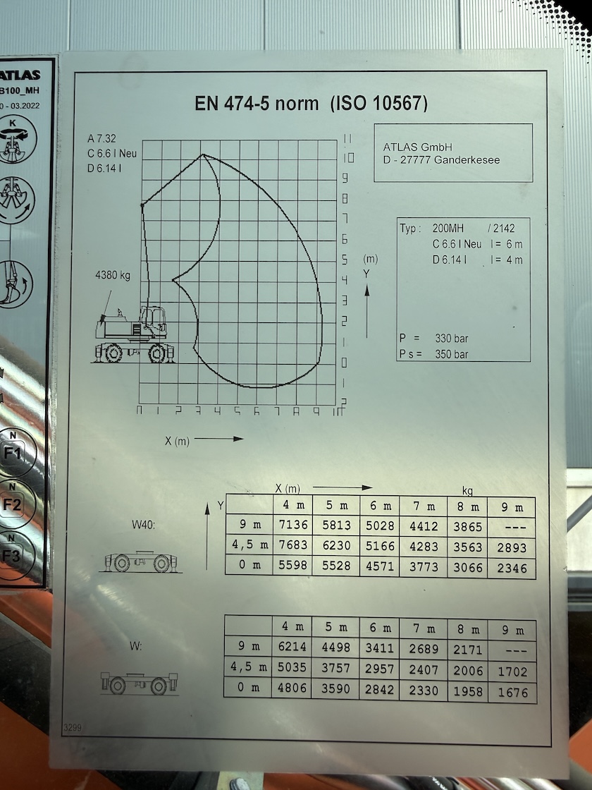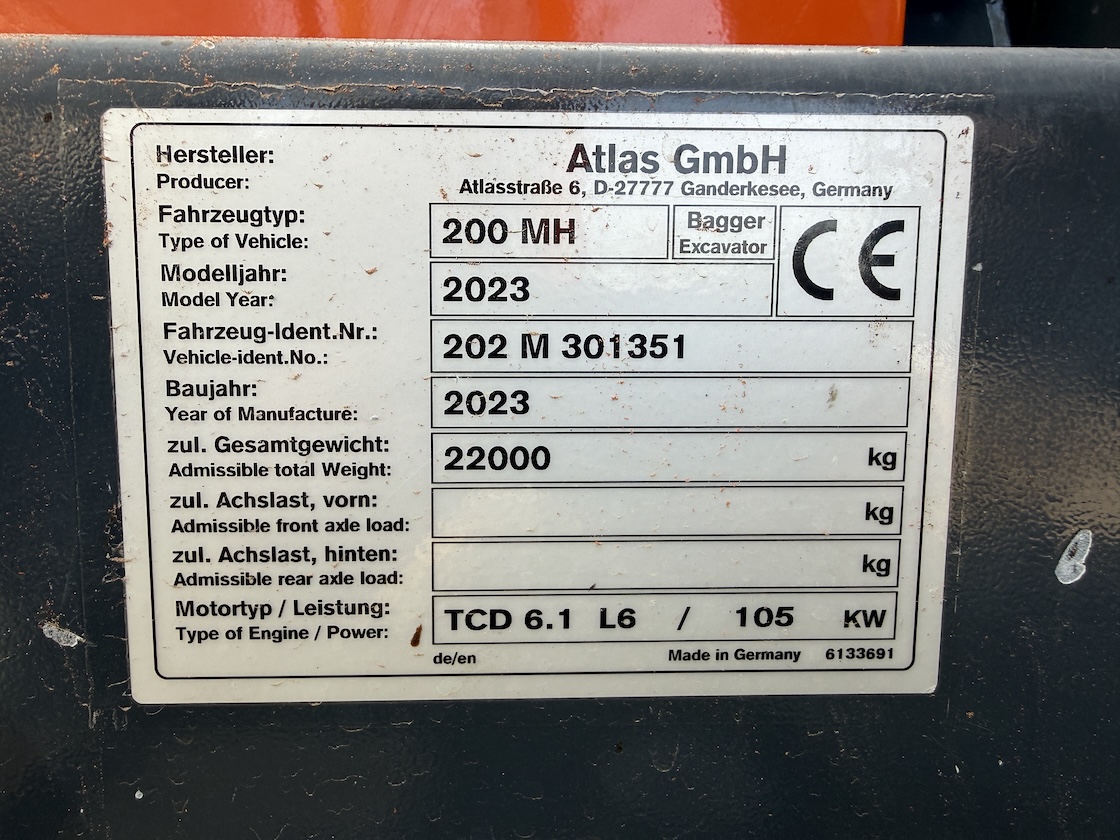 This Atlas 200MH is equipped with 4 cilinder water cooled turbo charged Deutz TCD 6.1 L6 (105kW) with just 3.324 working hours on the service meter. 6 meter boom, 4 meter stick which results in a reach of 10 meters. Sorting and demolition grab included, additional work lights, cabin protection, boxing ring, full rubber tires, 4 outriggers, central lubrication, rear and side view camera system, airco, radio etc..
