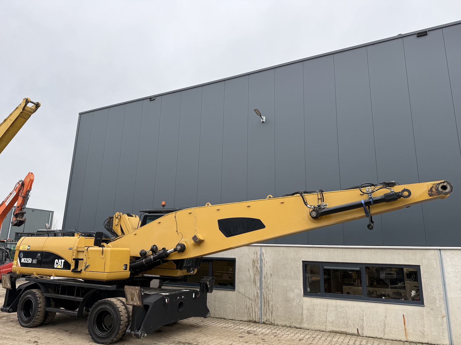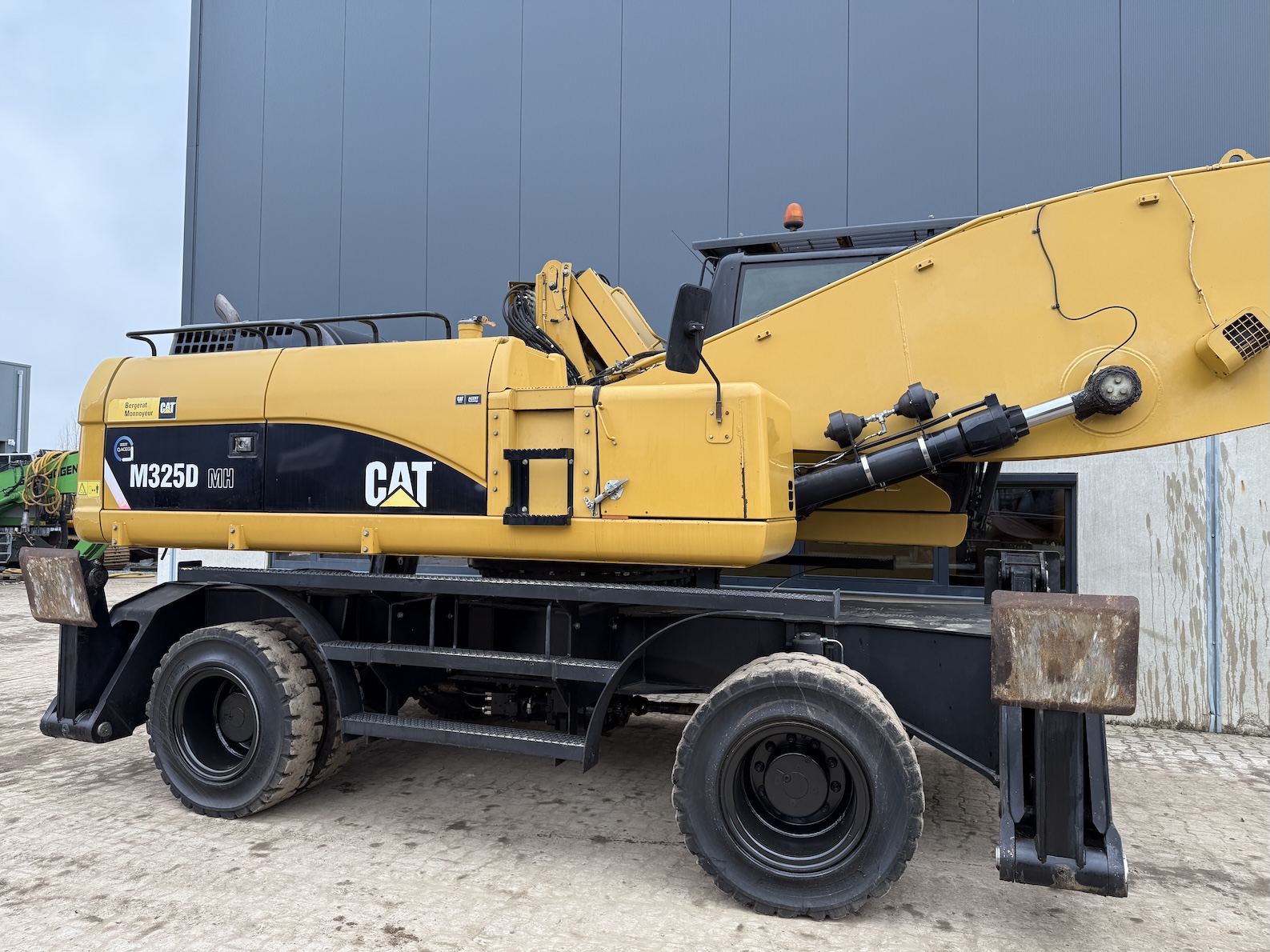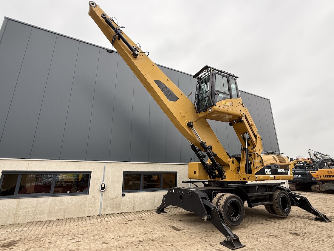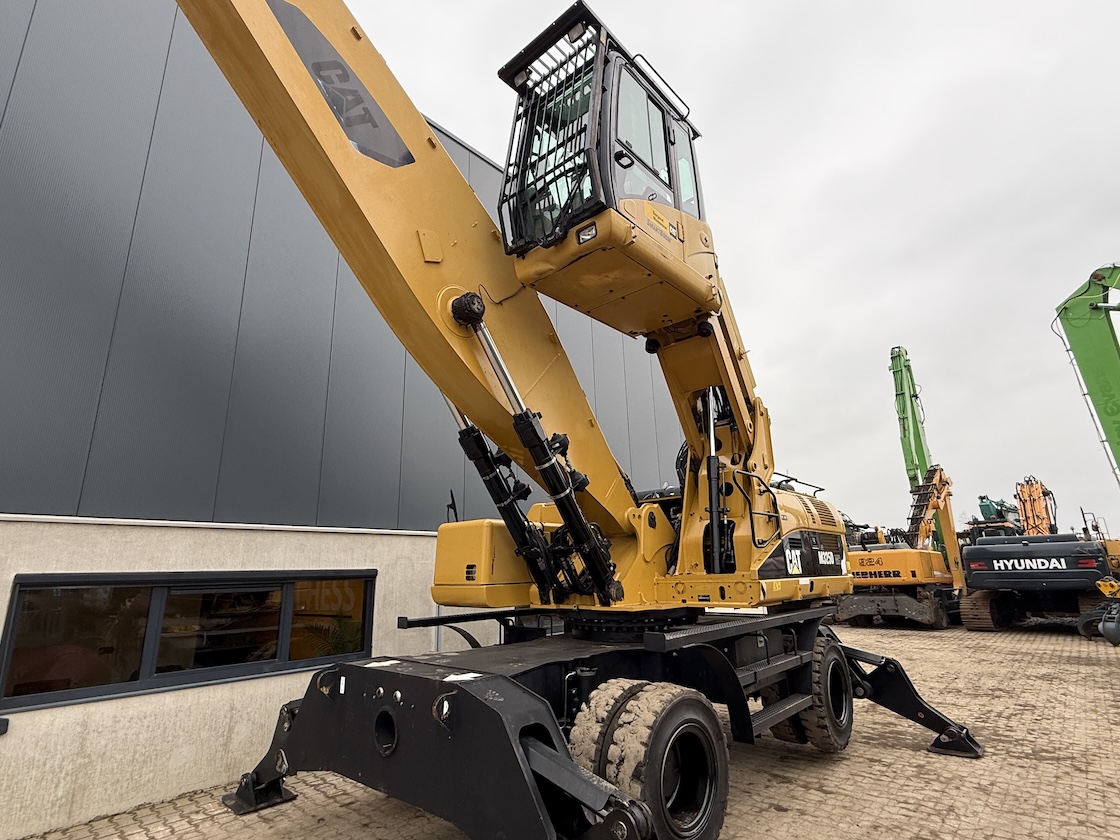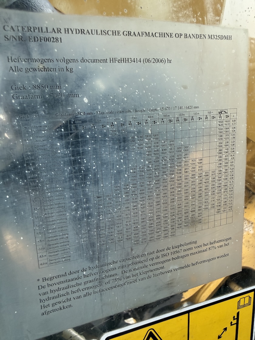 This Cat 325D-MH is equipped with a 6 cilinder water cooled turbo charged Cat 3126AT diesel engine (128kW) with 7843 working hours on the service meter. Boom length 8,85 meters and stick length being 7,42 meters, resulting in a reach of 15,67 meters without grab, height reach of 17,14 meters and debt of 6,42 meters. Full rubber tires, 4 outriggers, cabin protection, extra work lights, camera on the stick, additional books, airco, radio, central lubrication etc.