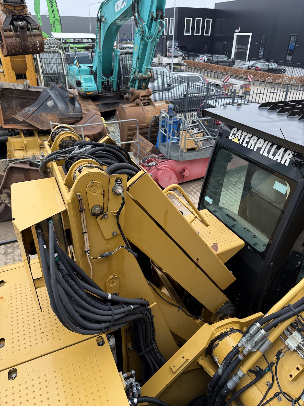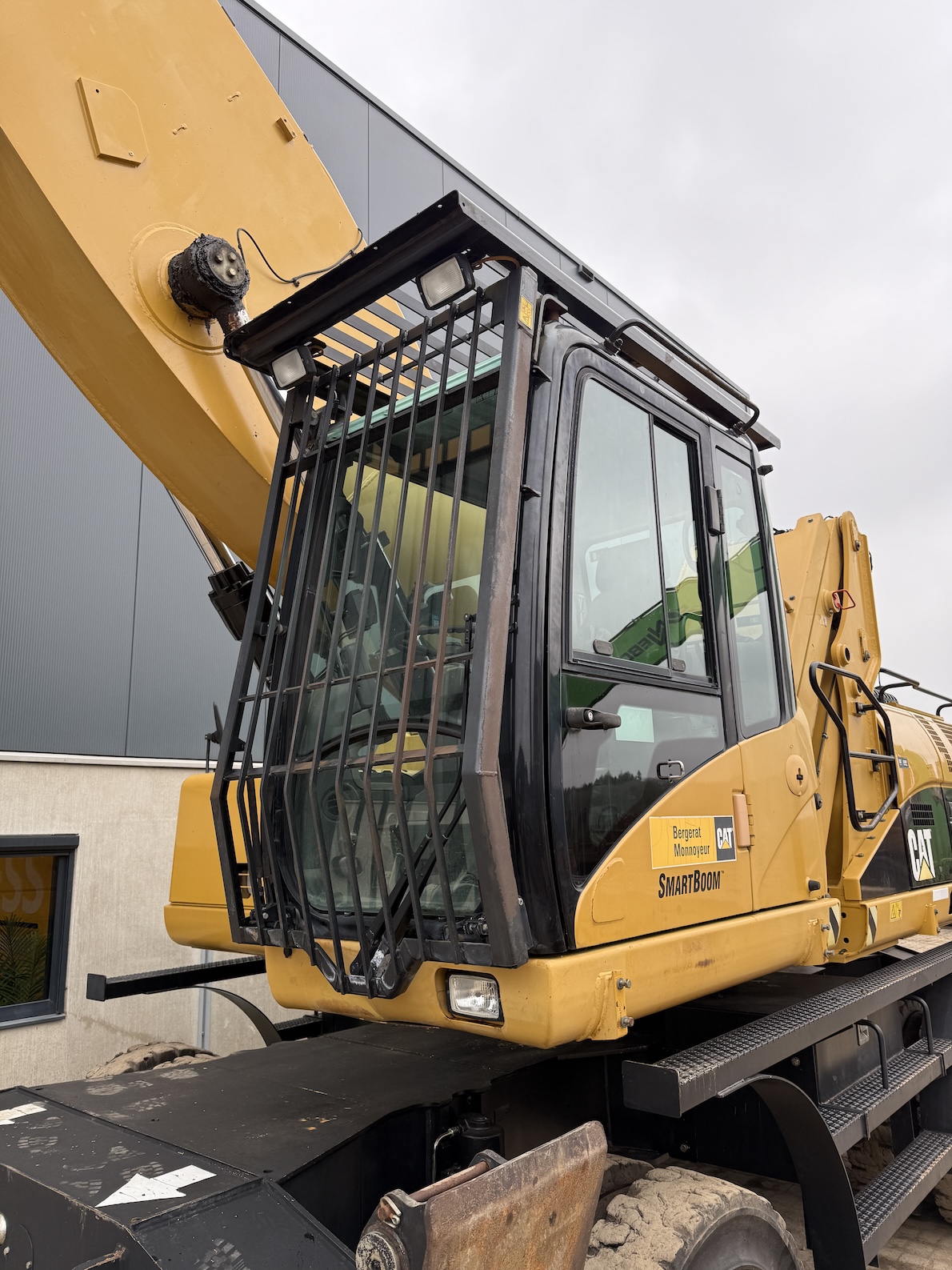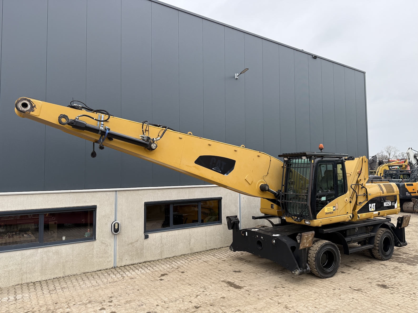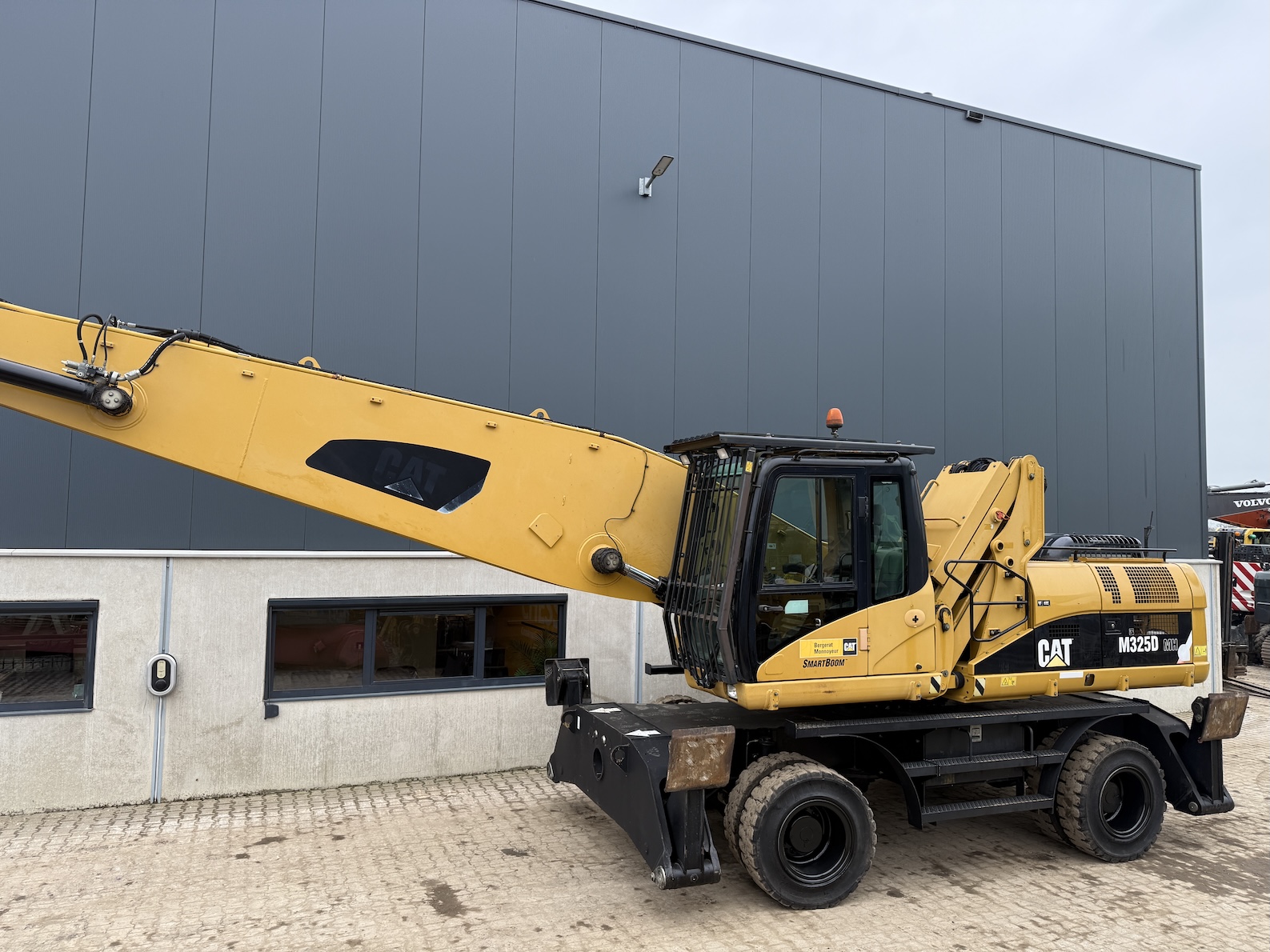 This Cat 325D-MH is equipped with a 6 cilinder water cooled turbo charged Cat 3126AT diesel engine (128kW) with 7843 working hours on the service meter. Boom length 8,85 meters and stick length being 7,42 meters, resulting in a reach of 15,67 meters without grab, height reach of 17,14 meters and debt of 6,42 meters. Full rubber tires, 4 outriggers, cabin protection, extra work lights, camera on the stick, additional books, airco, radio, central lubrication etc.