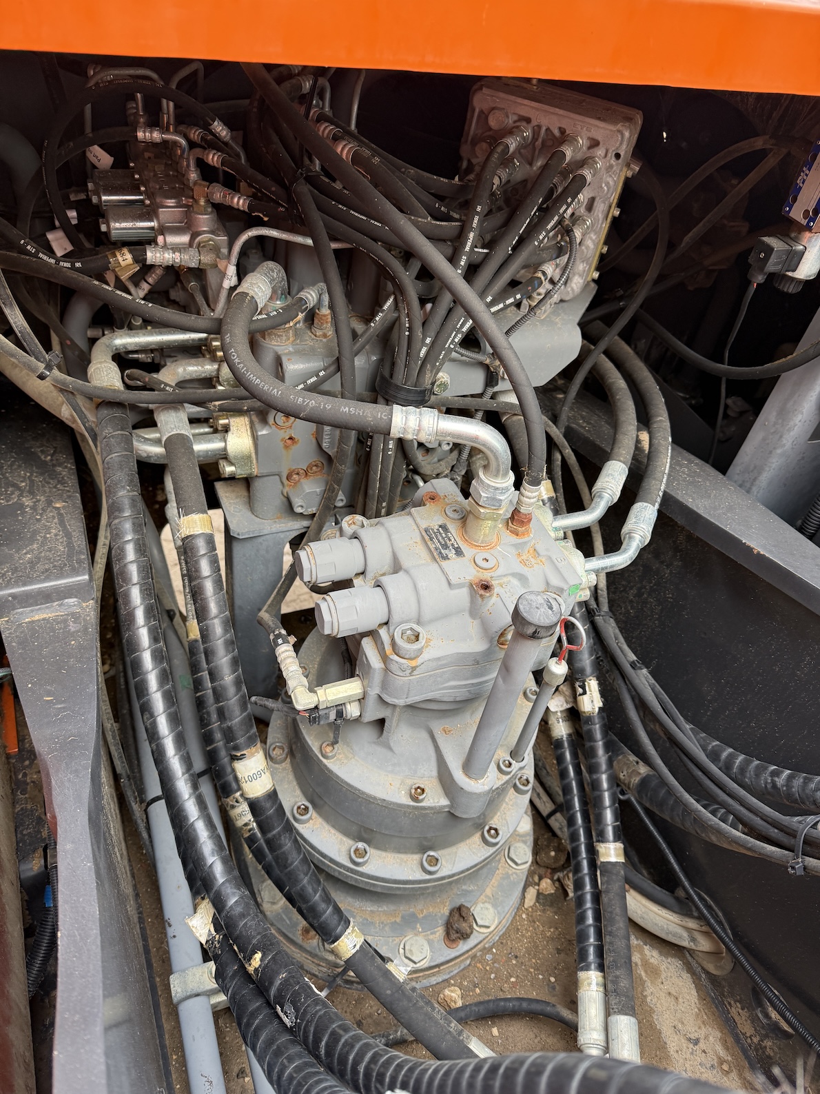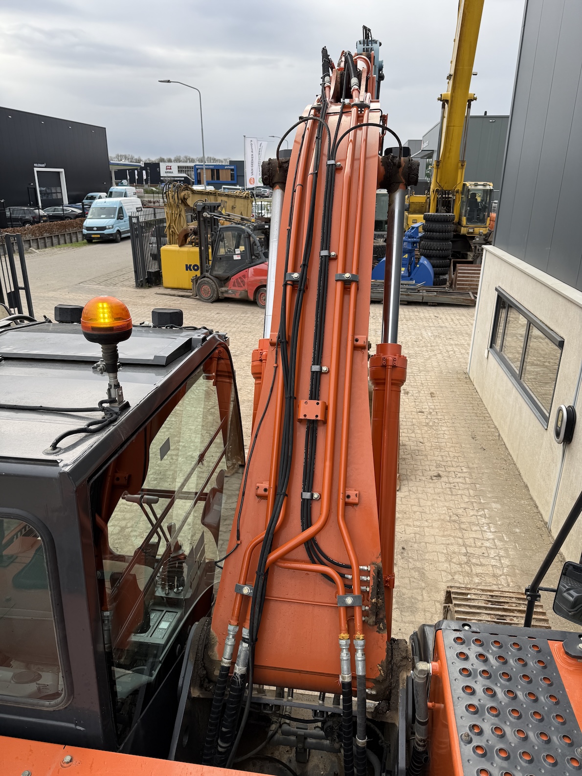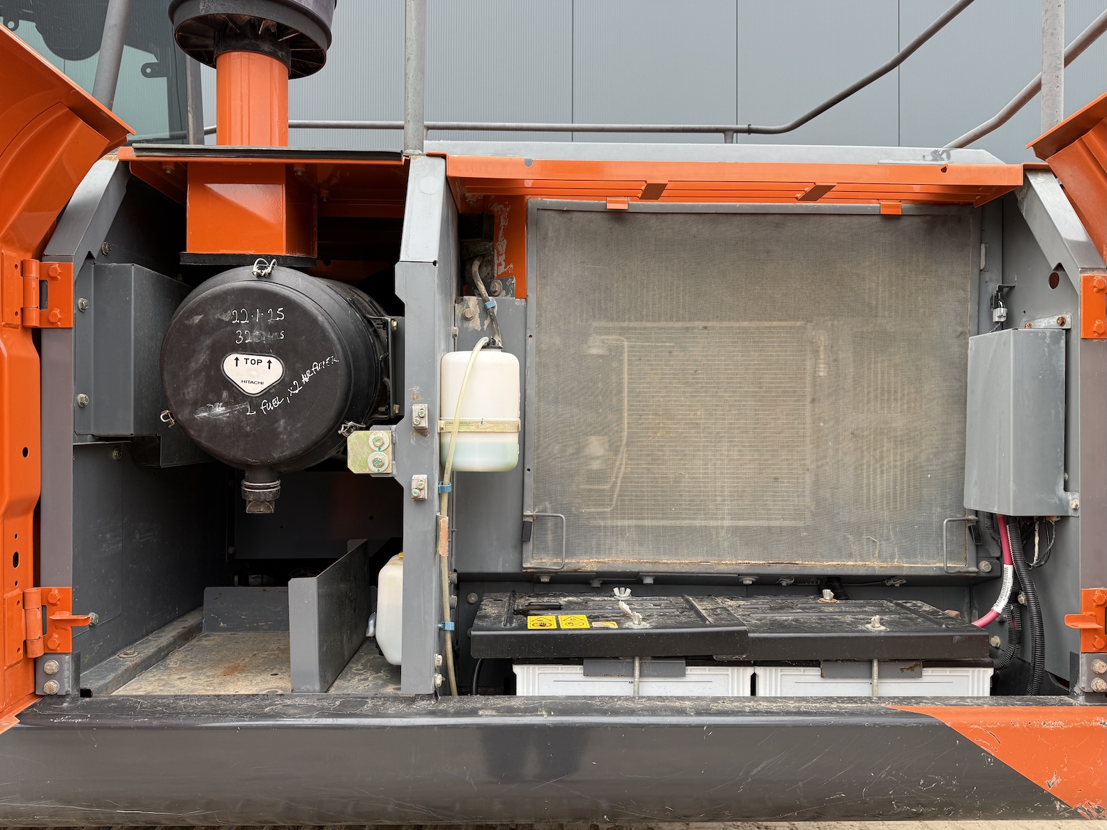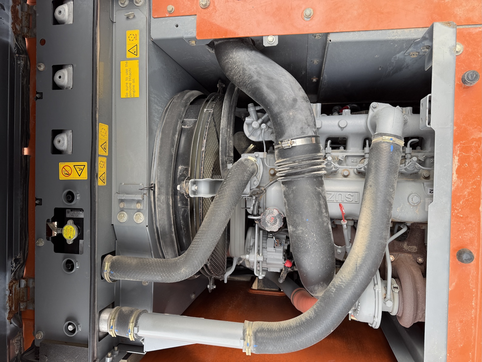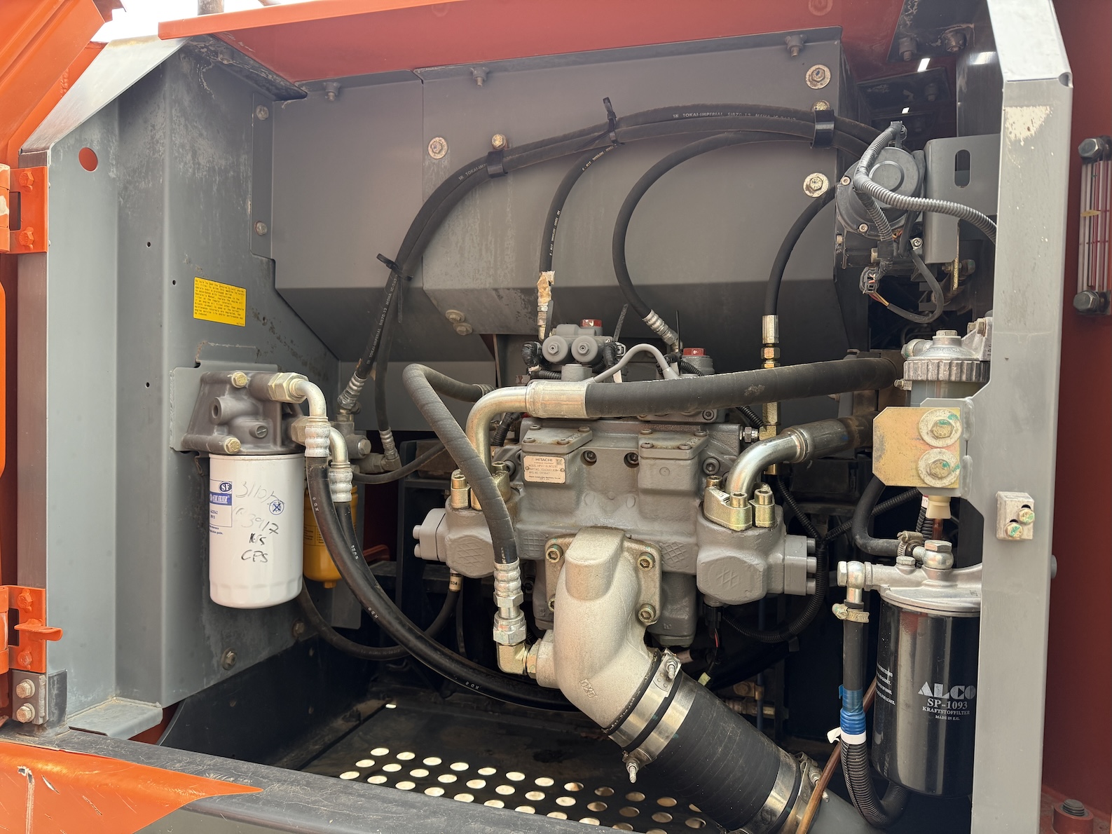 This Hitachi ZX220LC-GI tracked excavator is equipped with a 6 cilinder water cooled turbo charged Isuzu 6BG1 (130kW) diesel engine. More over, hydraulic quick hitch, teeth bucket, extra work , electric diesel pump, lights, top side guards, airco, radio etc. No electronics, no ad-blue, mechanical diesel pump!