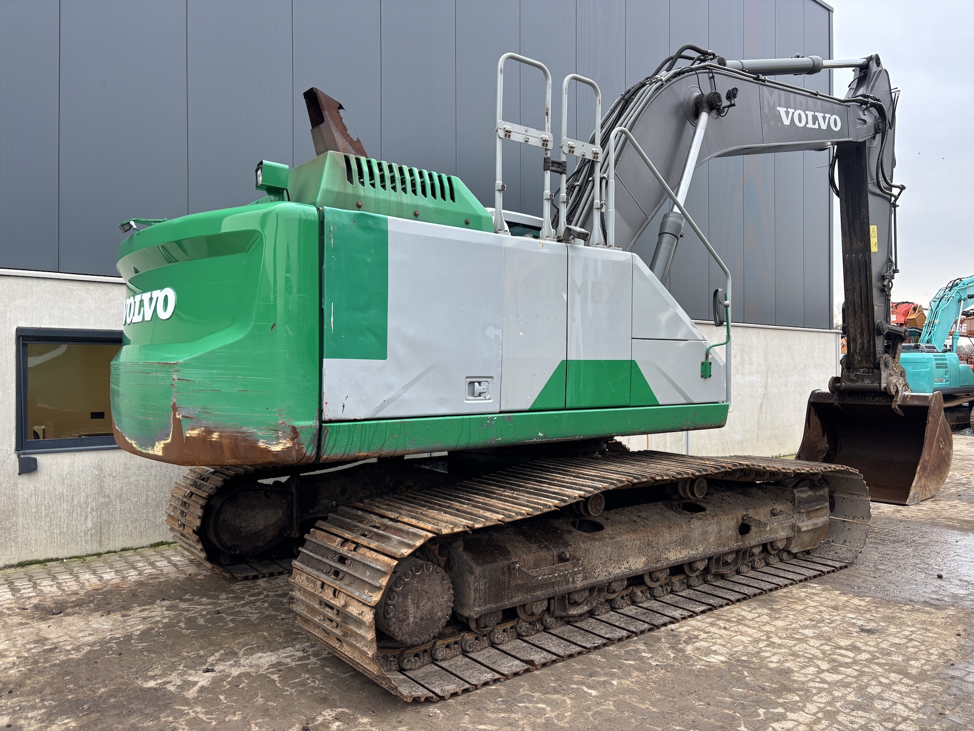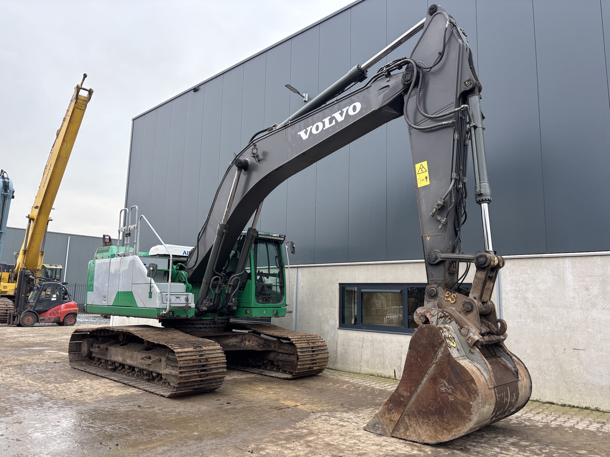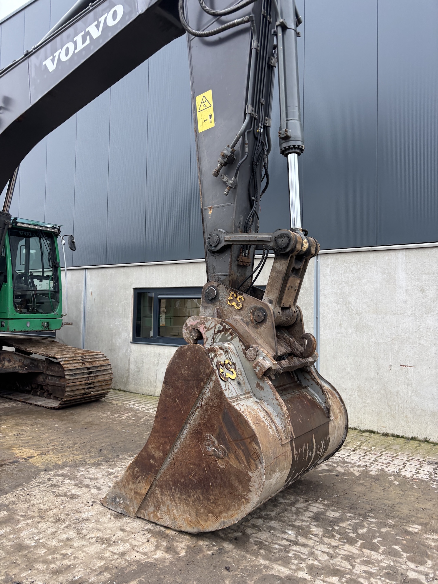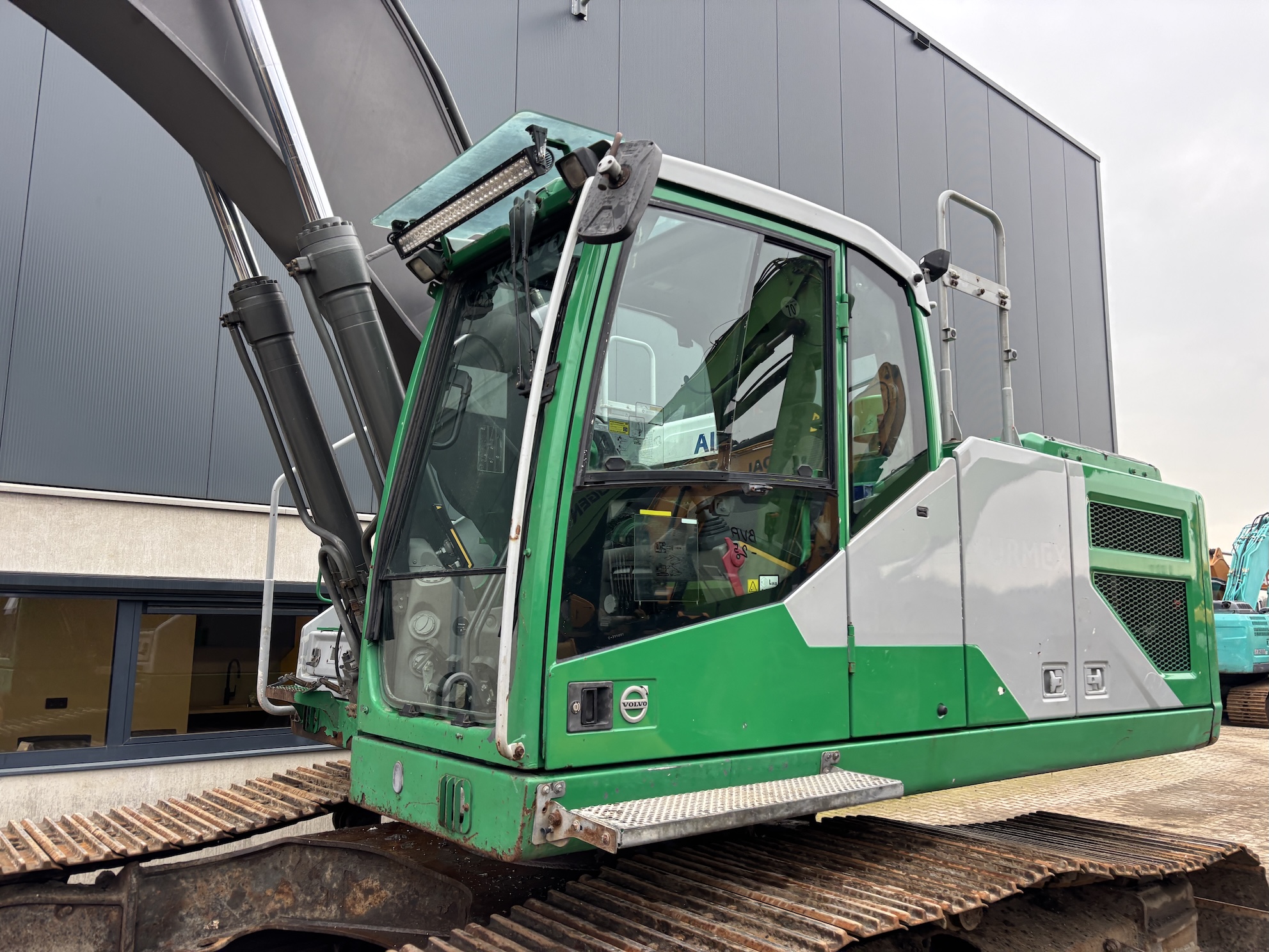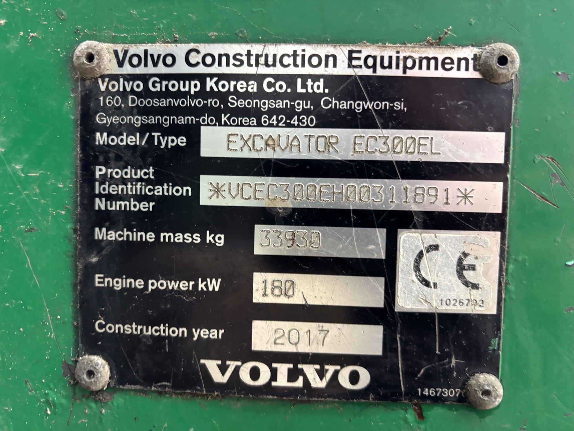 This Volvo EC300EL is equipped with a 6 cilinder water cooled turbo charged Volvo D8J (180kW) diesel engine with 13199 working hours on the service meter. Excellent bucket with CW hydraulic quick coupler, hydraulics for hammer and rotation function, central lubrication, all books and papers included, read and side view camera, airco, radio, additional work lights, electric diesel pump, additional cabin filter system etc..
